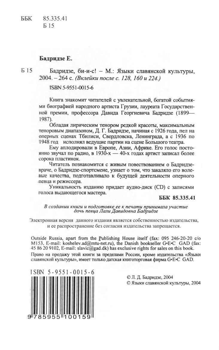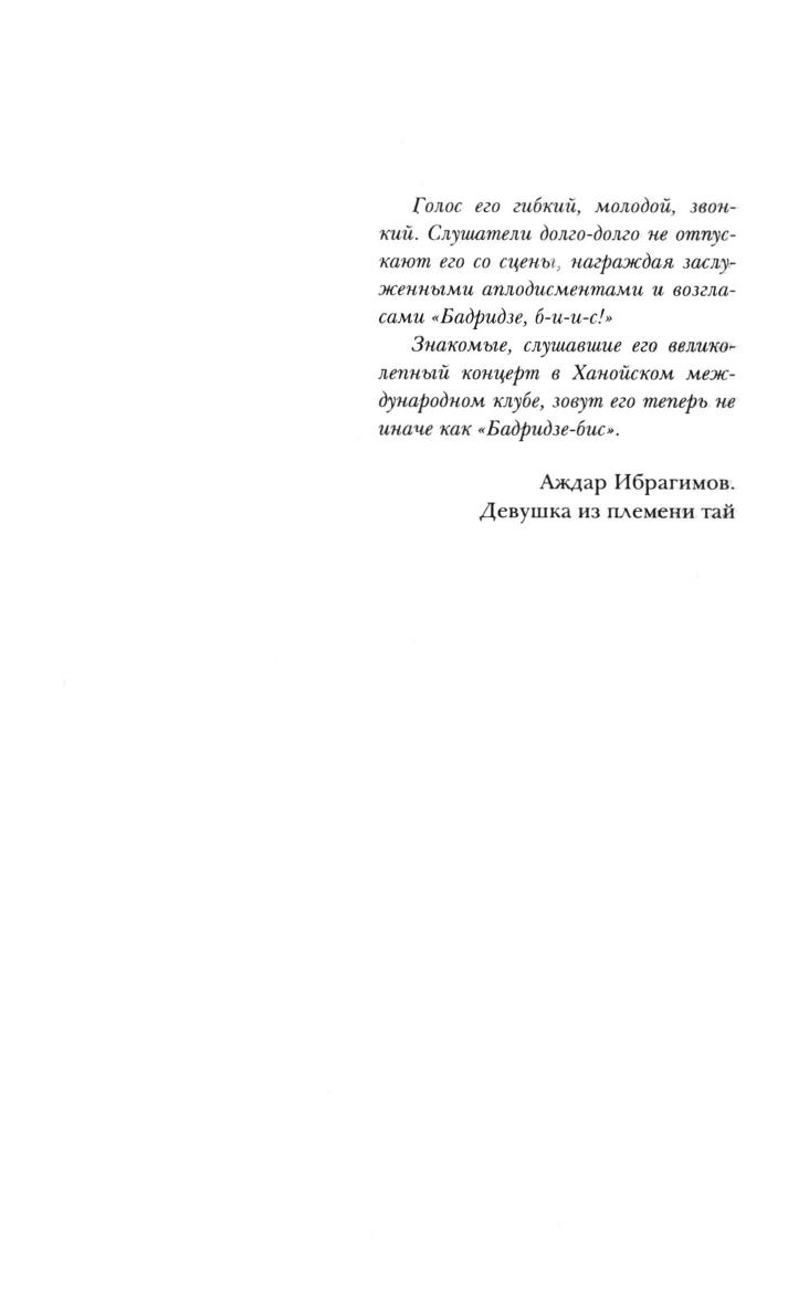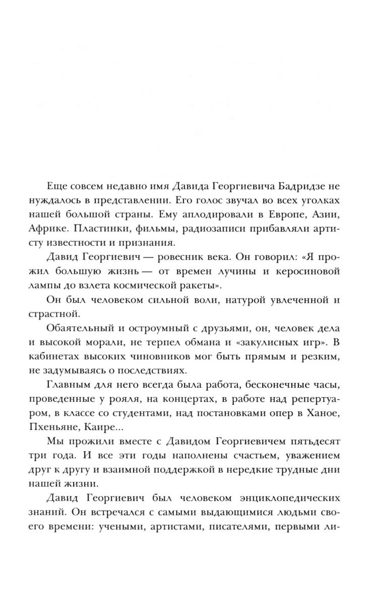 Книга знакомит читателей с увлекательной, богатой событиями биографией народного артиста Грузии, лауреата Государственной премии, профессора Давида Георгиевича Бадридзе. Обладая лирическим тенором редкой красоты, максимальным теноровым диапазоном, Д.Г. Бадридзе, начиная с 1926 года, пел на оперных сценах Тбилиси, Свердловска, Ленинграда, а с 1936 по 1948 год исполнял ведущие партии на сцене Большого театра. Ему аплодировали в Европе, Азии, Африке. Его голос постоянно звучал по радио, в 1930-х - 40-х годах артист записал более сорока пластинок. Читатель познакомится с живым повествованием о Бадридзе-враче, о Бадридзе-спортсмене, узнает о том, что закаляло его волевые качества, подготавливало к будущей деятельности оперного певца и режиссера.