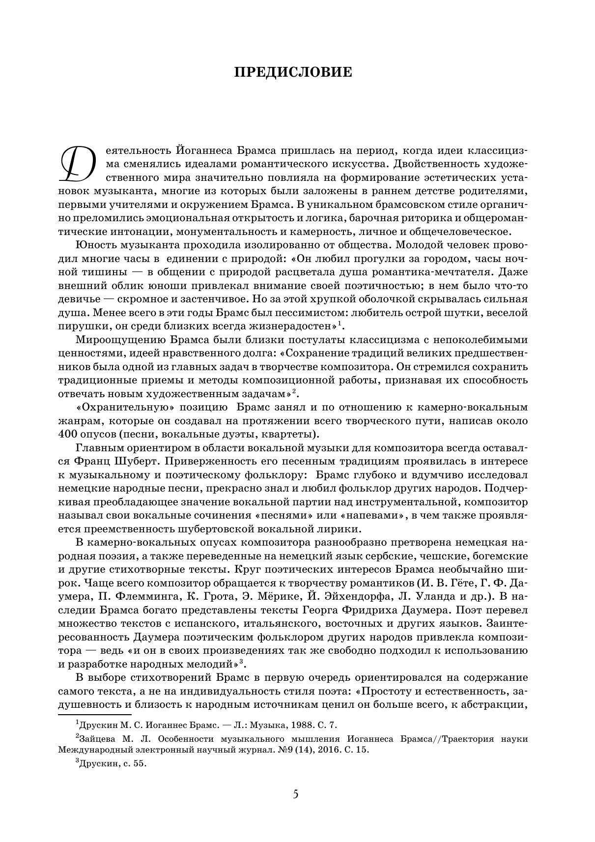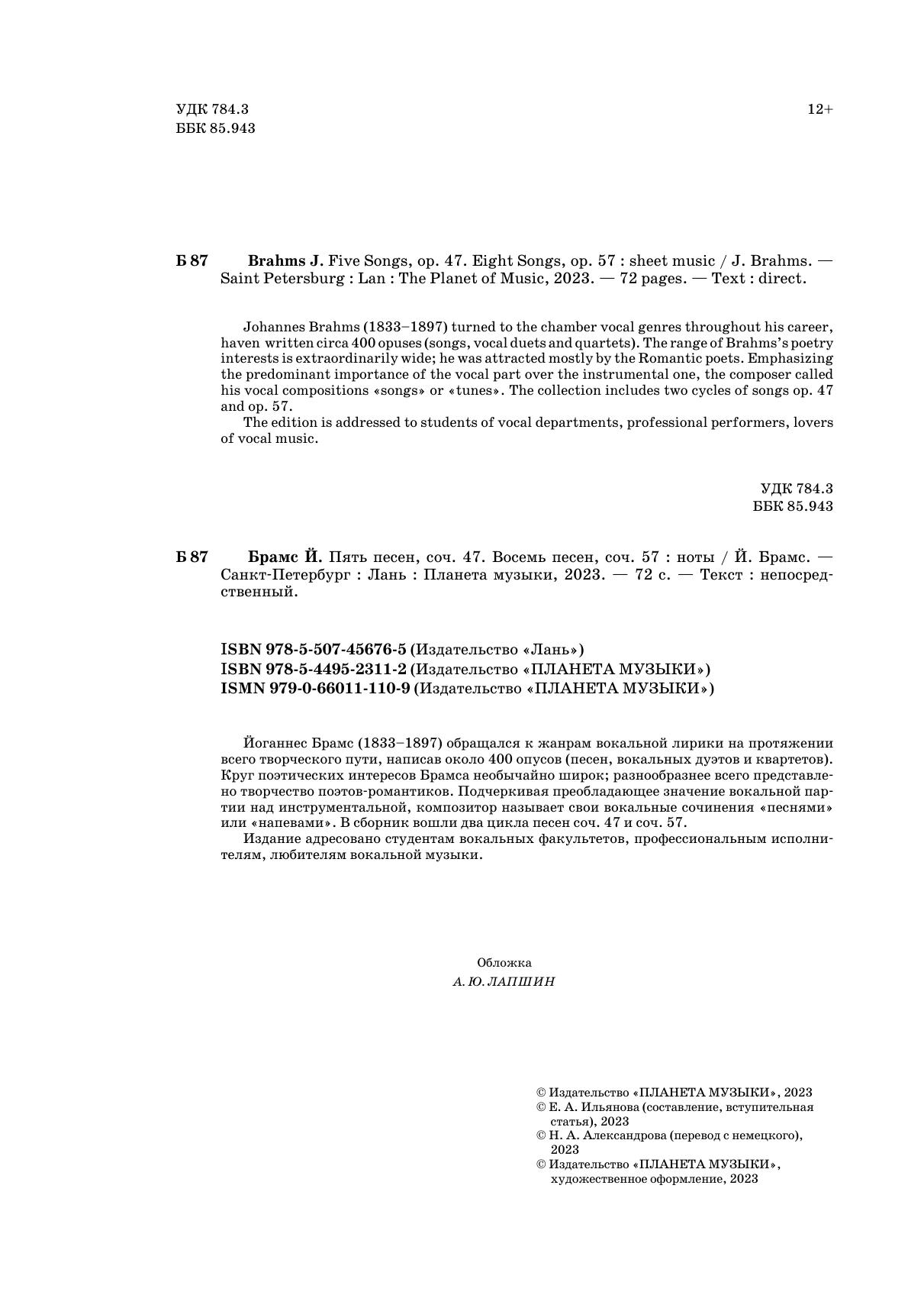 Иоганнес Брамс (1833-1897) обращался к жанрам вокальной лирики на протяжении всего творческого пути, написав около 400 опусов (песен, вокальных дуэтов и квартетов). Круг поэтических интересов Брамса необычайно широк; разнообразнее всего представлено творчество поэтов-романтиков. Подчеркивая преобладающее значение вокальной партии над инструментальной, композитор называет свои вокальные сочинения «песнями» или «напевами». В сборник вошли два цикла песен соч. 47 и соч. 57.