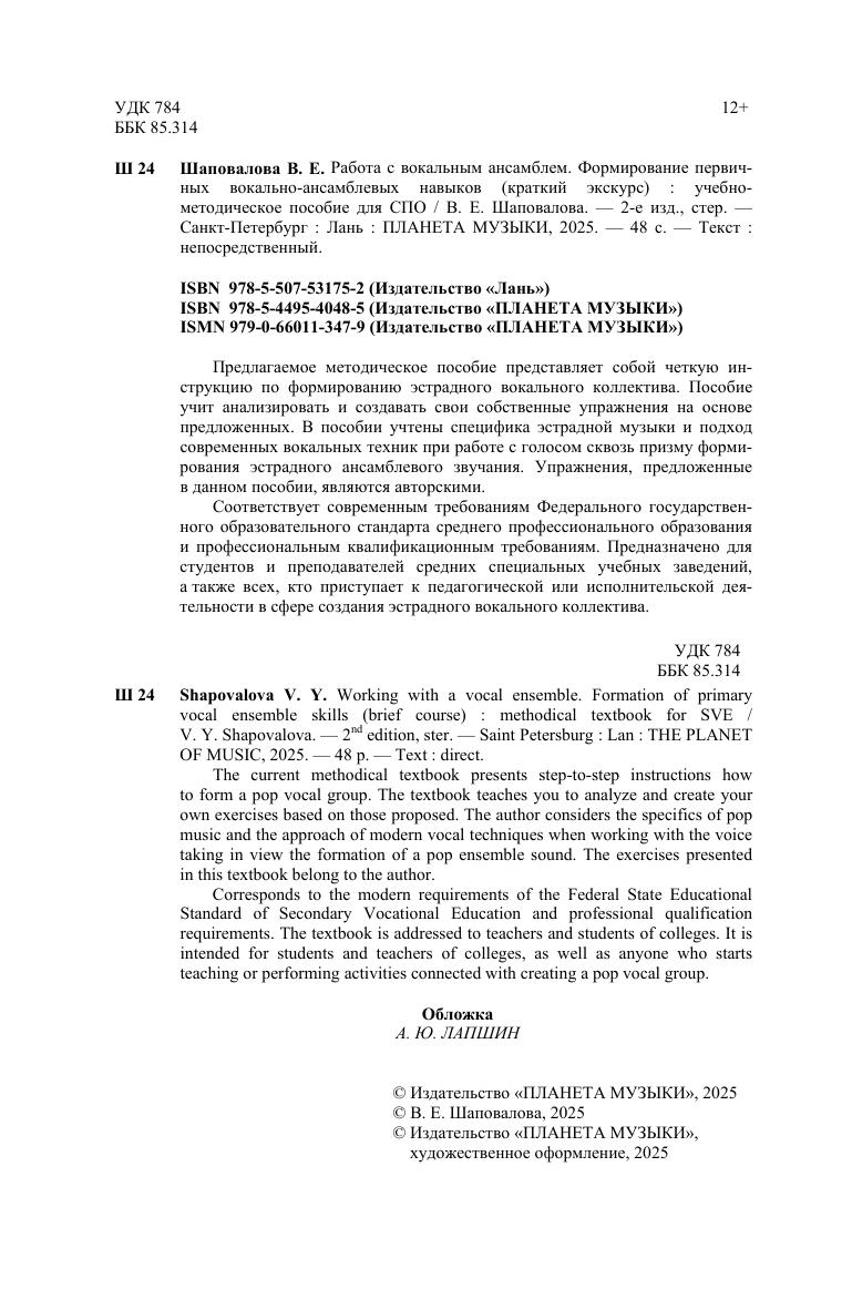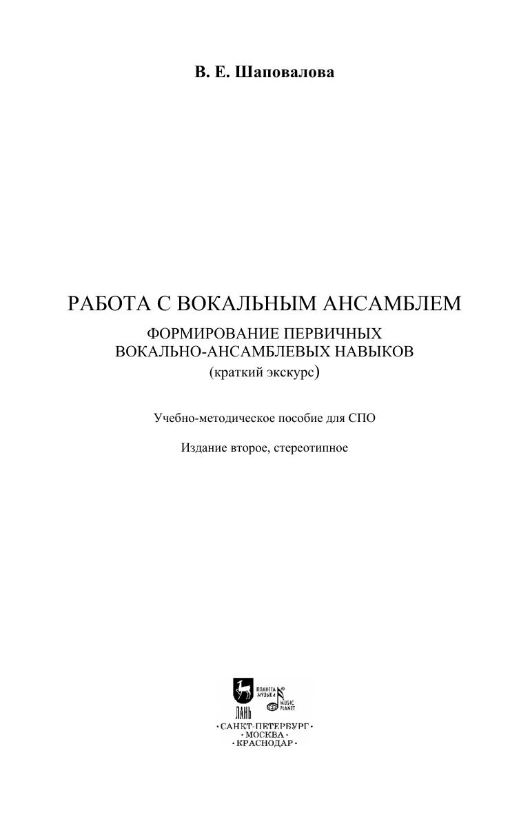 Предлагаемое методическое пособие представляет собой четкую инструкцию по формированию эстрадного вокального коллектива. Пособие учит анализировать и создавать свои собственные упражнения на основе предложенных. В пособие учтены специфика эстрадной музыки и подход современных вокальных техник при работе с голосом сквозь призму формирования эстрадного ансамблевого звучания. Упражнения предложенные в данном пособии являются авторскими. Соответствует современным требованиям Федерального государственного образовательного стандарта среднего профессионального образования и профессиональным квалификационным требованиям. Предназначено для студентов и преподавателей средних специальных учебных заведений, а также всех тех, кто приступает к педагогической или исполнительской деятельности в сфере создания эстрадного вокального коллектива. The current methodical textbook presents step-to-step instructions how to form a pop vocal group. The textbook teaches you to analyze and create your own exercises based on those proposed. The author considers the specifics of pop music and the approach of modern vocal techniques when working with the voice taking in view the formation of a pop ensemble sound. The exercises presented in this textbook belong to the author. Corresponds to the modern requirements of the Federal State Educational Standard of Secondary Vocational Education and professional qualification requirements. The textbook is addressed to teachers and students of colleges. It is intended for students and teachers of colleges, as well as anyone who starts teaching or performing activities connected with creating a pop vocal group.