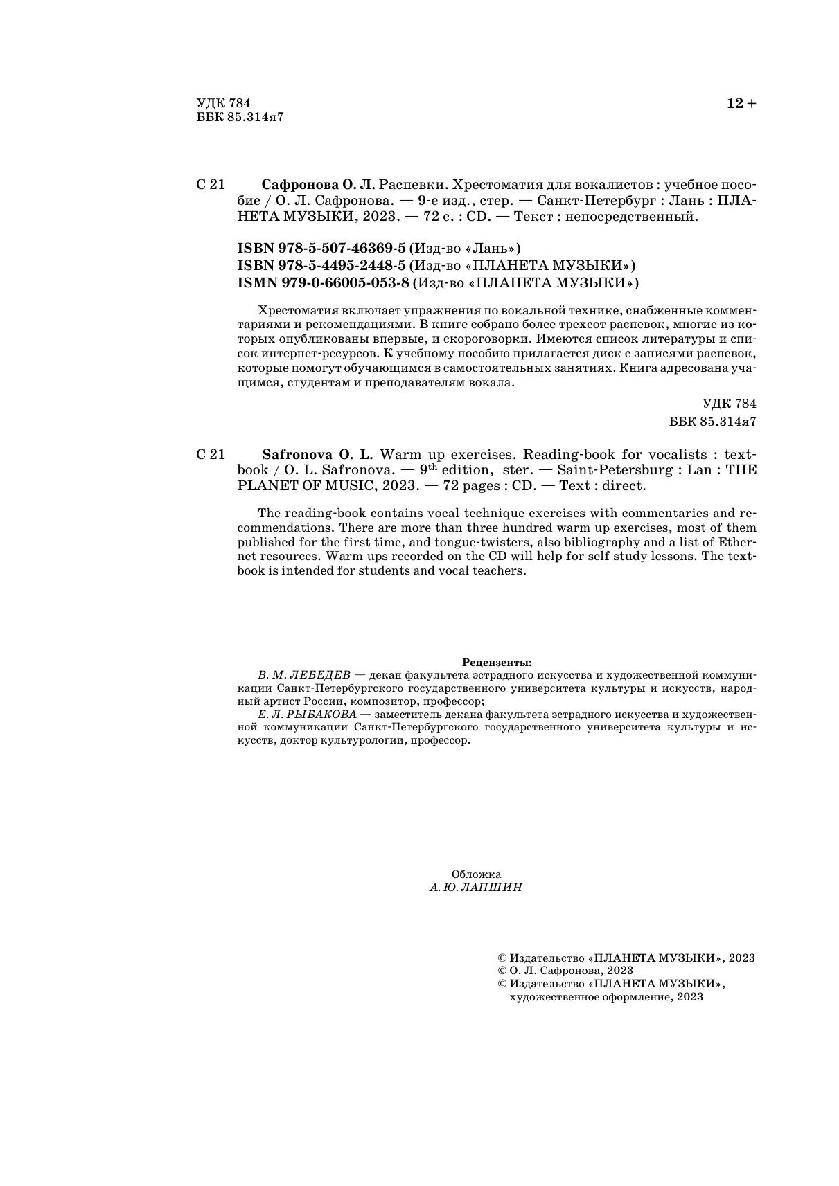 Хрестоматия включает упражнения по вокальной технике, снабженные комментариями и рекомендациями. В книге собрано около трехсот распевок, многие из которых опубликованы впервые, и скороговорки. В данное издание включен целый ряд новых упражнений. Имеются список литературы и список интернет-ресурсов. К учебному пособию прилагается диск с записями распевок, которые помогут обучающимся в самостоятельных занятиях. Книга адресована учащимся, студентам и преподавателям вокала.