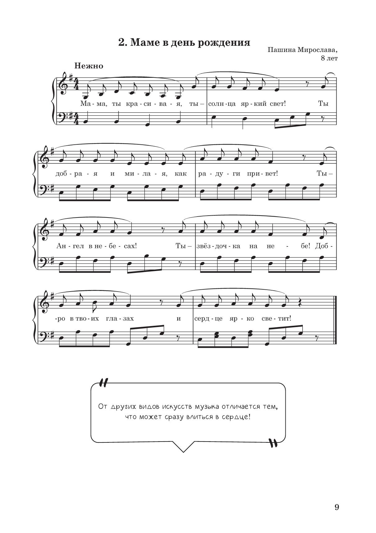 Вы держите в руках не обычный сборник, а удивительные и уникальные «Разноцветные нотки» – первое в России издание, состоящее из музыки, написанной детьми. В «Разноцветных нотках» собраны песенки, пьесы и высказывания о музыке учеников Е. А. Поддубной – музыканта, педагога, автора детских песен, игр, сказок, руководителя Творческого открытого пространства «Обыкновенное чудо». На страницах сборника самые маленькие музыканты воплотили в колыбельных и считалках, вальсах и маршах образы родных и близких людей, природных явлений, животных и птиц – свои необыкновенные чувства и эмоции. Старшие детки сумели передать в музыке радость первых открытий и путешествий, времени, когда появляются настоящие друзья, и мир становится всё интересней! Сборник понравится юным музыкантам, станет вдохновением для педагогов и непременно привлечет внимание любителей музыки. Here you have not an ordinary collection, but an amazing and unique “Multi-Coloured Little Music Notes”, the first collection in Russia consisting of music written by children. The “Multi-Coloured Little Music Notes” includes songs, pieces and phrases about music by the students of E. A. Poddubnaya, the musician, teacher, author of children’s songs, games, fairy tales, director of the Creative Open Space “The Ordinary Miracle”. The youngest musicians expressed their extraordinary feelings and emotions, the images of their families and friends, scenes of nature, animals and birds in lullabies and counting rhymes, waltzes and marches of this collection. The older children managed to convey in music the joy of first discoveries and trips, joy of the time when real friends appear and the world around becomes more and more interesting! The collection will appeal to young musicians, will become an inspiration for teachers and will certainly attract the attention of music lovers.