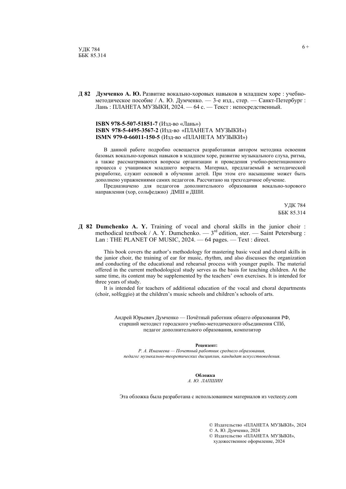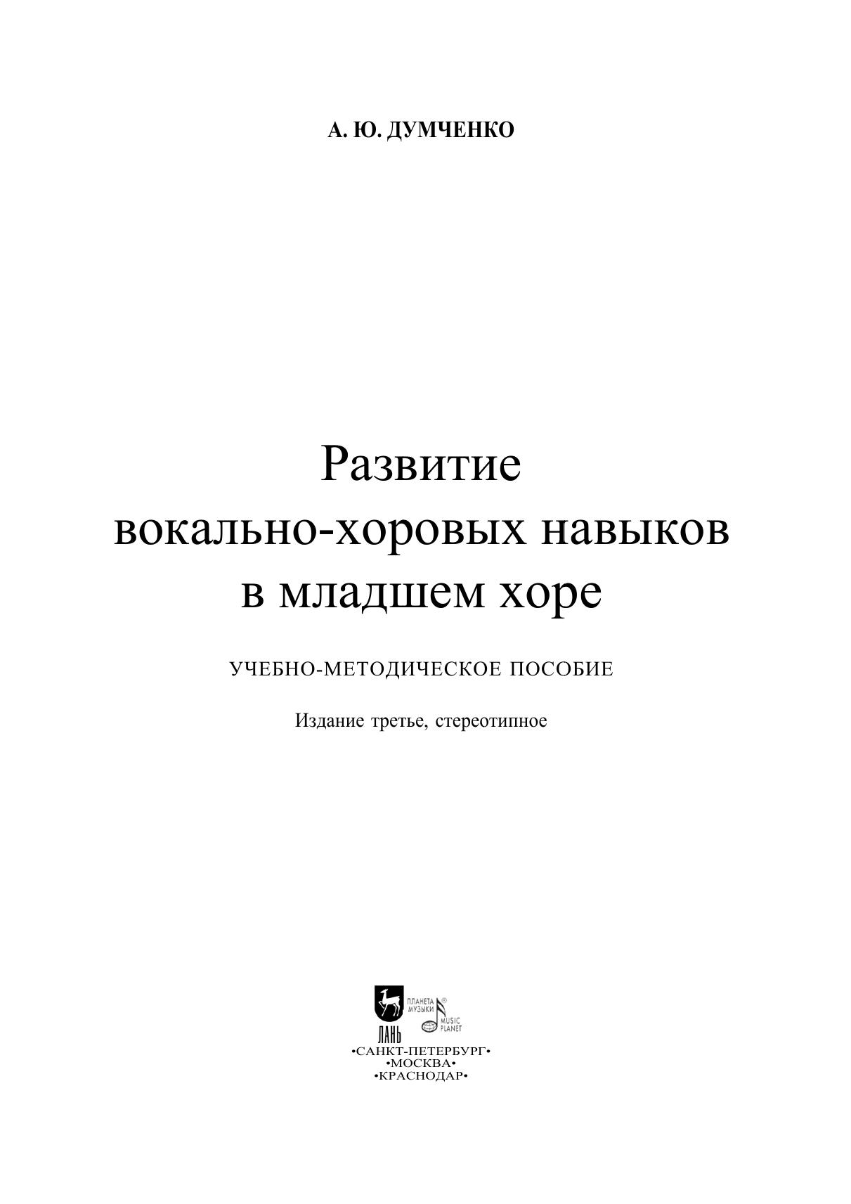 В данной работе подробно освещается разработанная автором методика освоения базовых вокально-хоровых навыков в младшем хоре, развитие музыкального слуха, ритма, а также рассматриваются вопросы организации и проведения учебно-репетиционного процесса с учащимися младшего возраста. Материал, предлагаемый в методической разработке, служит основой в обучении детей. При этом его насыщение может быть дополнено упражнениями самих педагогов. Рассчитано на трехгодичное обучение. Предназначено для педагогов дополнительного образования вокально-хорового направления (хор, сольфеджио) ДМШ и ДШИ. This book covers the author’s methodology for mastering basic vocal and choral skills in the junior choir, the training of ear for music, rhythm, and also discusses the organization and conducting of the educational and rehearsal process with younger pupils. The material offered in the current methodological study serves as the basis for teaching children. At the same time, its content may be supplemented by the teachers’ own exercises. It is intended for three years of study. It is intended for teachers of additional education of the vocal and choral departments (choir, solfeggio) at the children’s music schools and children’s schools of arts.