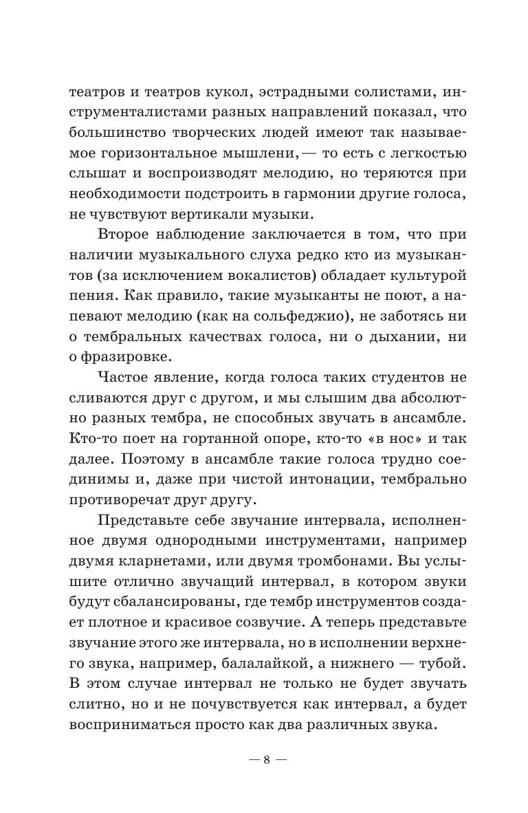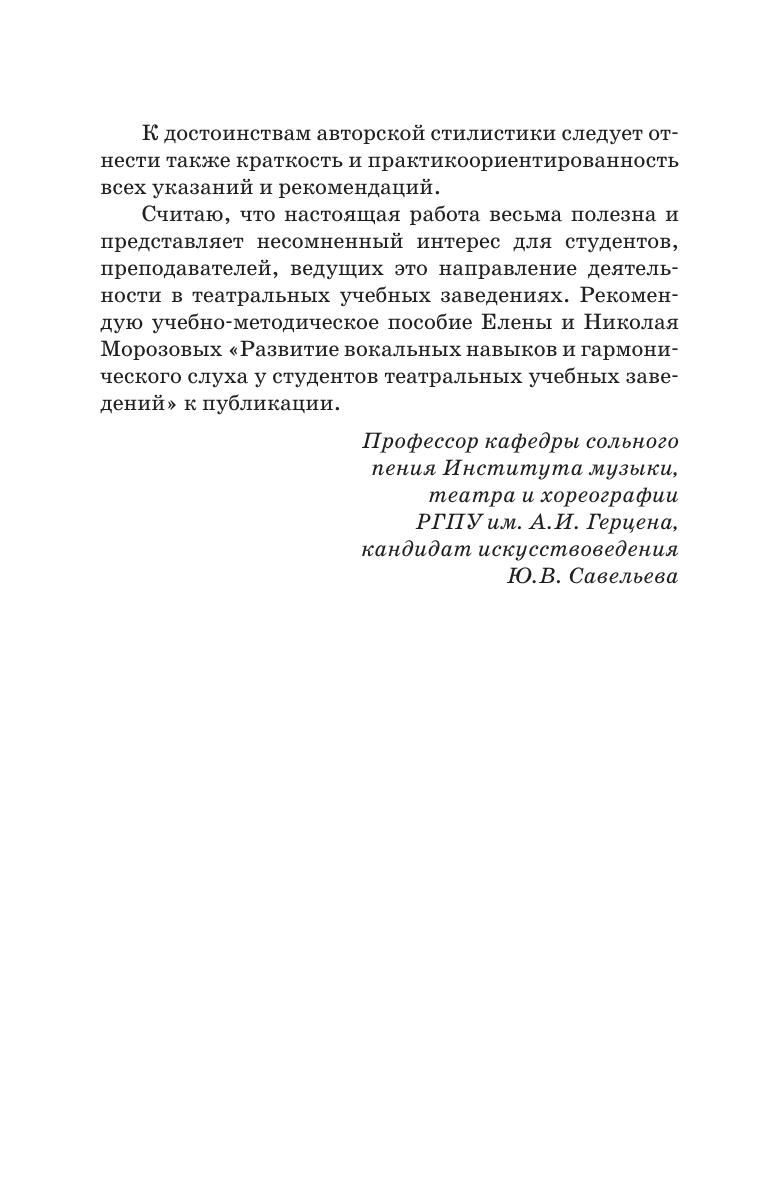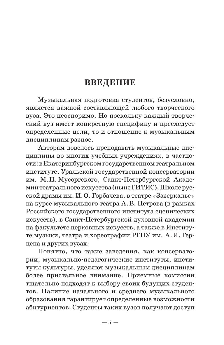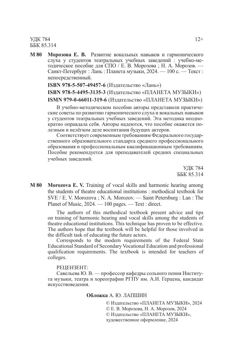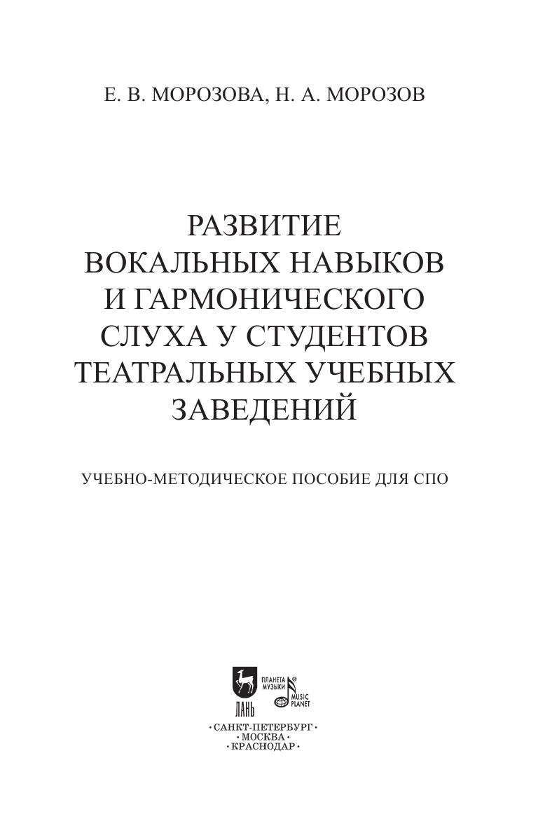 В учебно-методическом пособии авторы представили практиче- ские советы по развитию гармонического слуха и вокальных навыков у студентов театральных учебных заведений. Эта методика неодно- кратно оправдала себя. Авторы надеются, что пособие окажется по- лезным в нелёгком деле воспитания будущих актеров. Соответствует современным требованиям Федерального государ- ственного образовательного стандарта среднего профессионального образования и профессиональным квалификационным требованиям. Пособие рекомендуется для преподавателей средних специальных учебных заведений. The authors of this methodical textbook present advice and tips on training of harmonic hearing and vocal skills among the students of theatre educational institutions. This technique has proven to be effective. The authors hope that the textbook will be helpful for those involved in the difficult task of educating the future actors. Corresponds to the modern requirements of the Federal State Educational Standard of Secondary Vocational Education and professional qualification requirements. The textbook is intended for teachers of colleges.