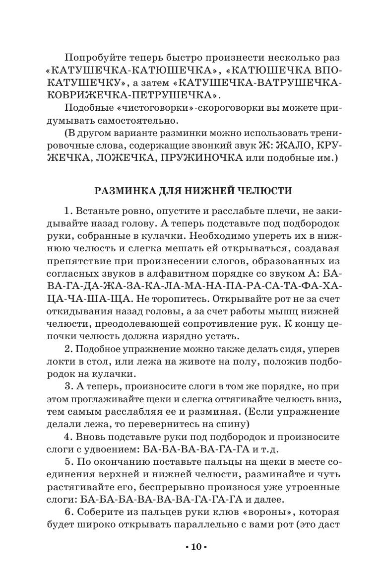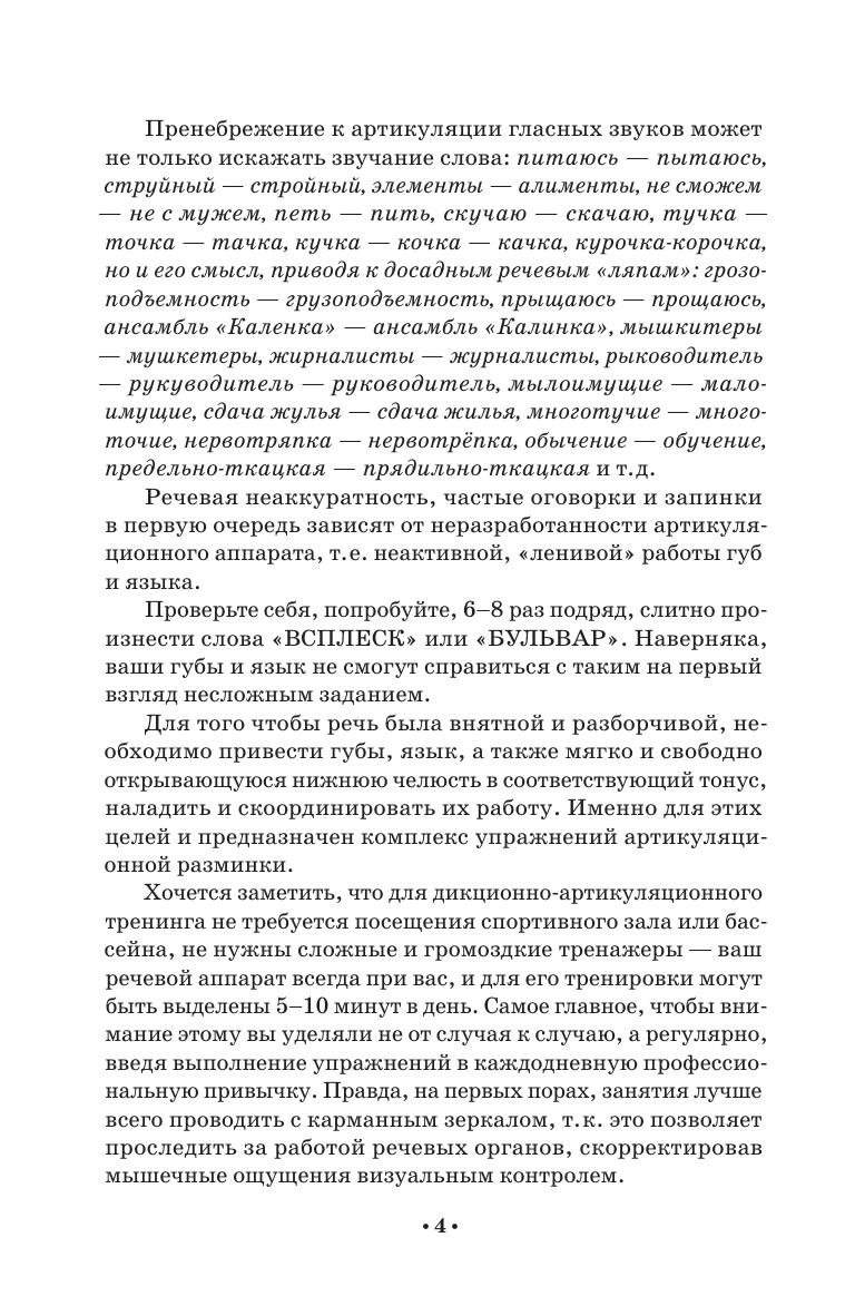 Данное пособие знакомит с основами тренинга дикции, артикуляции, резонаторного звучания, развития звуковысотного диапазона, овладения перспективой высказывания. Оно призвано помочь развить природные голосовые возможности и улучшить многие составляющие качественной речи. Представленный в книге обширный материал тренировочных звукосочетаний, скороговорок и различных игр со звуками и словами поможет значительно разнообразить речевые задания и упражнения. Пособие предназначено для абитуриентов, студентов, аспирантов творческих учебных заведений, преподавателей предметов «Сценическая речь» и «Художественное слово», а также всем, чья деятельность связана с речевым общением. This textbook represents the basics of training diction, articulation, resonant sound, the development of the pitch range, mastering the perspective of speech. It is designed to help develop natural voice capabilities and improve many features of a fine speech. The rich collection of training sound combinations, tongue twisters and various games with sounds and words presented in the book will help to diversify significantly speech tasks and exercises. The textbook is intended for applicants, students, graduate students of schools of arts, teachers of the “Stage speech” and “Artistic word”, as well as everyone whose activities are related to communication via speech.