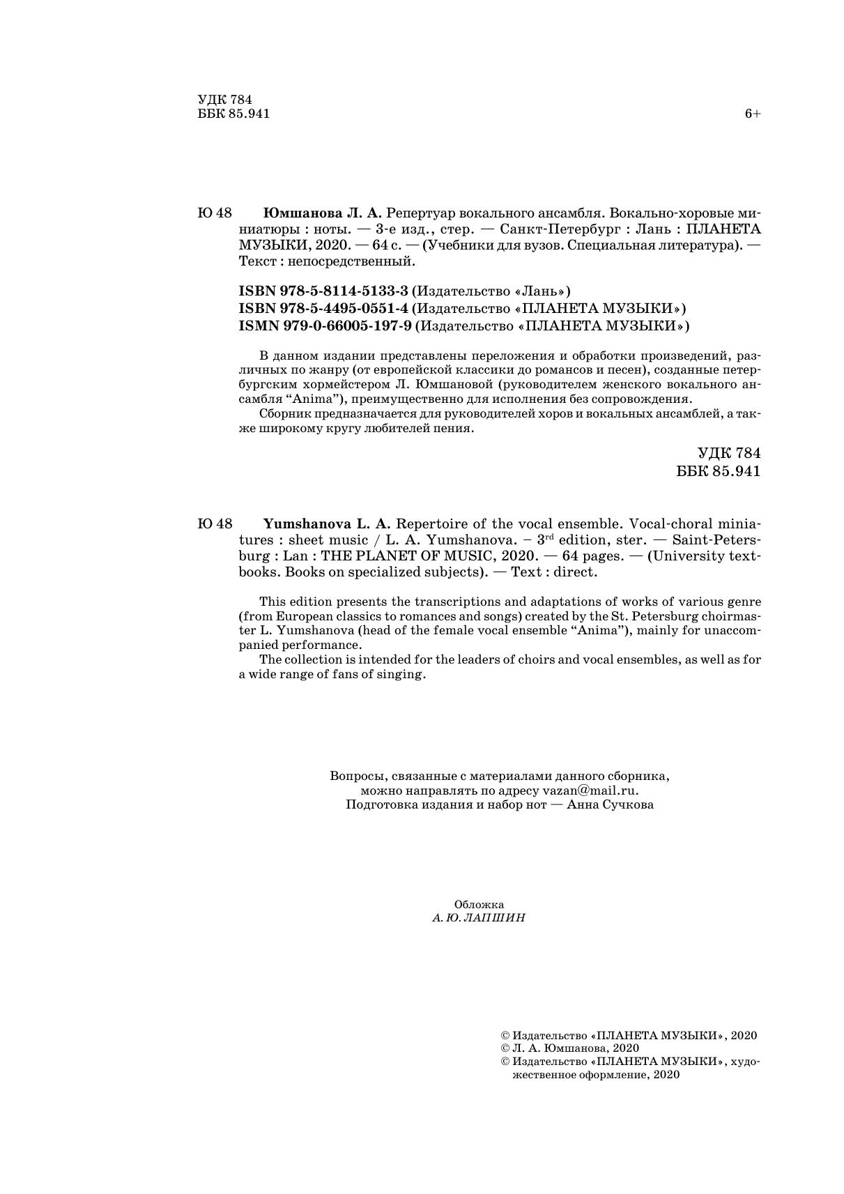 В данном издании представлены переложения и обработки произведений, различных по жанру (от европейской классики до романсов и песен), созданные петербургским хормейстером Л. Юмшановой (руководителем женского вокального ансамбля "Anima"), преимущественно для исполнения без сопровождения. Сборник предназначается для руководителей хоров и вокальных ансамблей, а также широкому кругу любителей пения.