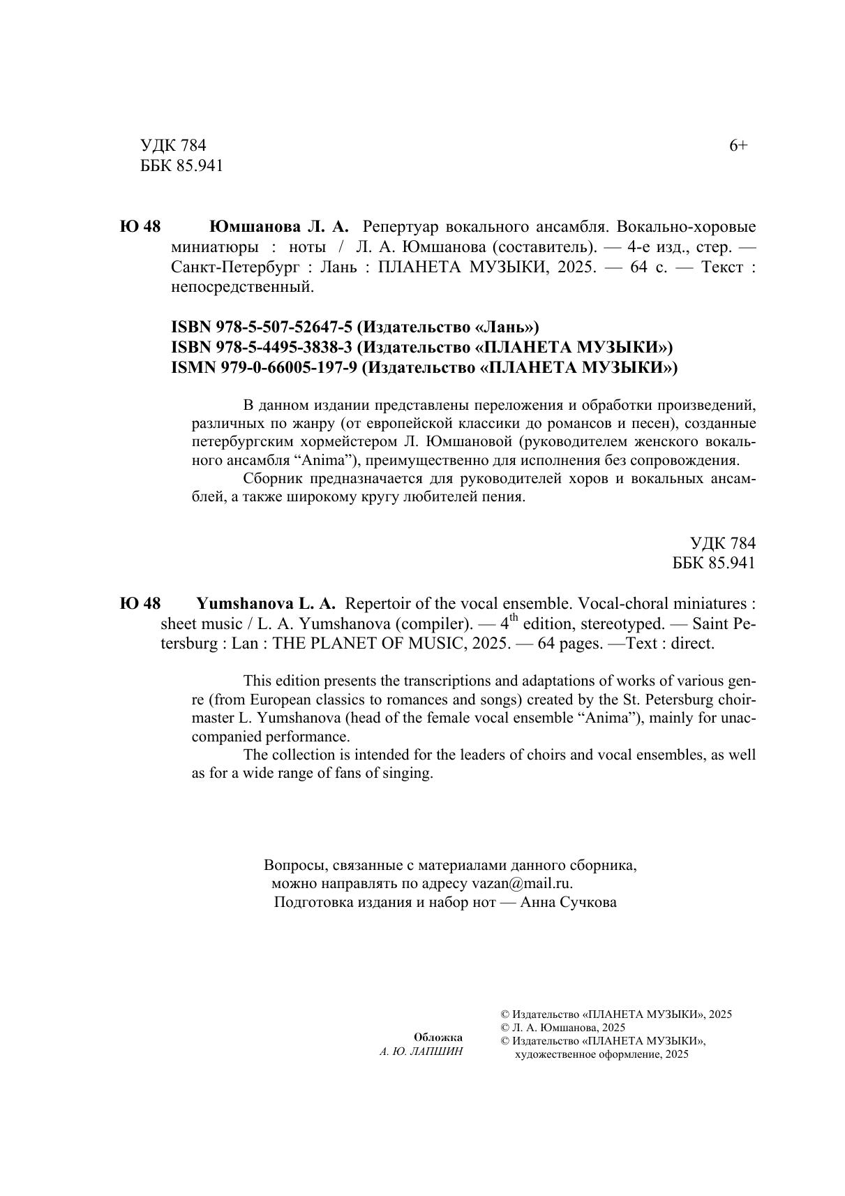 В данном издании представлены переложения и обработки произведений, различных по жанру (от европейской классики до романсов и песен), созданные петербургским хормейстером Л. Юмшановой (руководителем женского вокального ансамбля "Anima"), преимущественно для исполнения без сопровождения. Сборник предназначается для руководителей хоров и вокальных ансамблей, а также широкому кругу любителей пения.