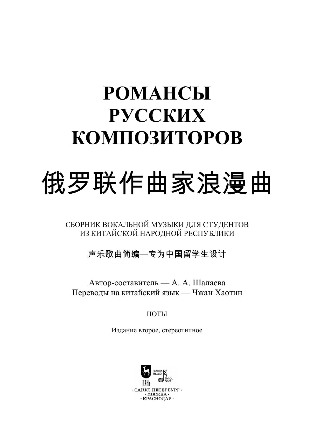 Романсы русских композиторов. Сборник вокальной музыки для студентов из Китайской Народной Республики