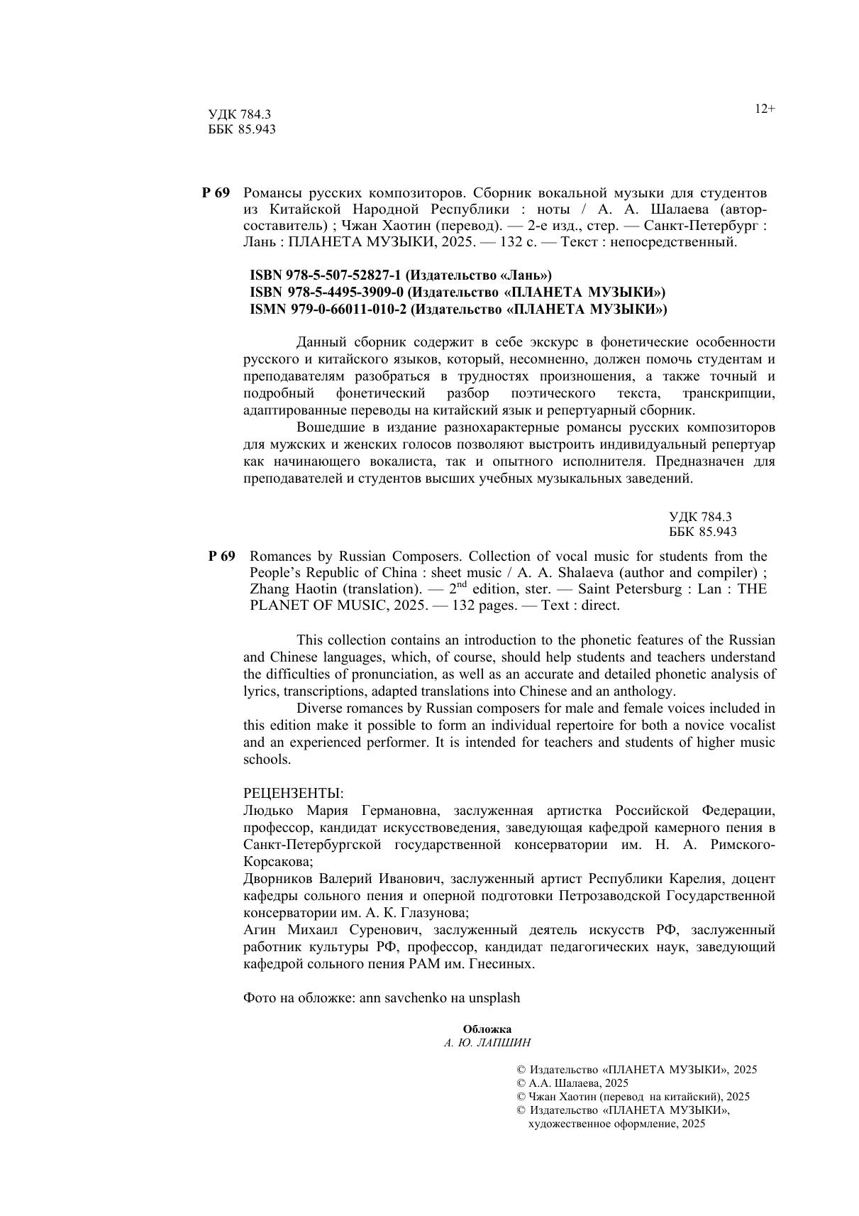 Данный сборник содержит в себе экскурс в фонетические особенности русского и китайского языков, который, несомненно, должен помочь студентам и преподавателям разобраться в трудностях произношения, а также точный и подробный фонетический разбор поэтического текста, транскрипции, адаптированные переводы на китайский язык и репертуарный сборник. Вошедшие в издание разнохарактерные романсы русских композиторов для мужских и женских голосов позволяют выстроить индивидуальный репертуар как начинающего вокалиста, так и опытного исполнителя. Предназначен для преподавателей и студентов высших учебных музыкальных заведений.