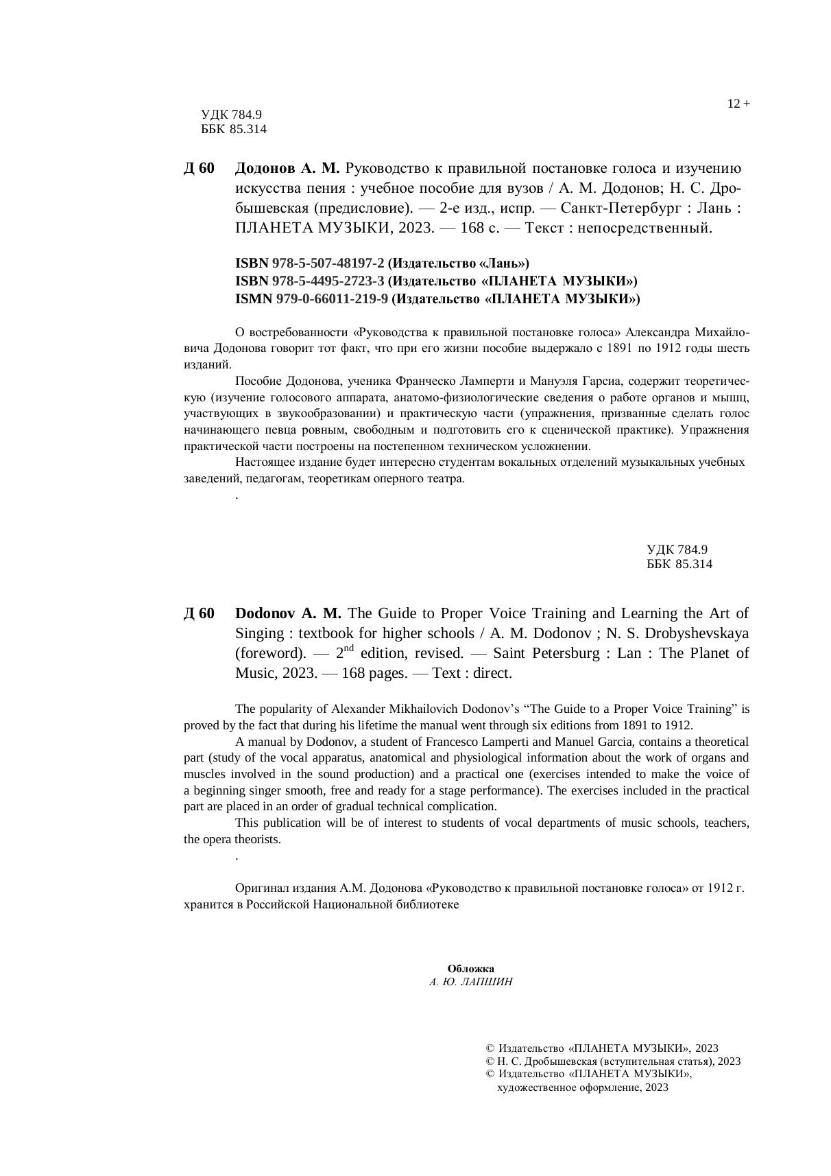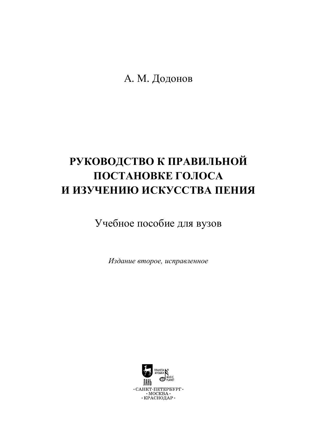 О востребованности «Руководства к правильной постановке голоса» Александра Михайловича Додонова говорит тот факт, что при его жизни пособие выдержало с 1891 по 1912 годы шесть изданий. Пособие Додонова, ученика Франческо Ламперти и Мануэля Гарсиа, содержит теоретическую (изучение голосового аппарата, анатомо-физиологические сведения о работе органов и мышц, участвующих в звукообразовании) и практическую части (упражнения, призванные сделать голос начинающего певца ровным, свободным и подготовить его к сценической практике). Упражнения практической части построены на постепенном техническом усложнении. Настоящее издание будет интересно студентам вокальных отделений музыкальных учебных заведений, педагогам, теоретикам оперного театра. The popularity of Alexander Mikhailovich Dodonov’s “The Guide to a Proper Voice Training” is proved by the fact that during his lifetime the manual went through six editions from 1891 to 1912. A manual by Dodonov, a student of Francesco Lamperti and Manuel Garcia, contains a theoretical part (study of the vocal apparatus, anatomical and physiological information about the work of organs and muscles involved in the sound production) and a practical one (exercises intended to make the voice of a beginning singer smooth, free and ready for a stage performance). The exercises included in the practical part are placed in an order of gradual technical complication. This publication will be of interest to students of vocal departments of music schools, teachers, the opera theorists.