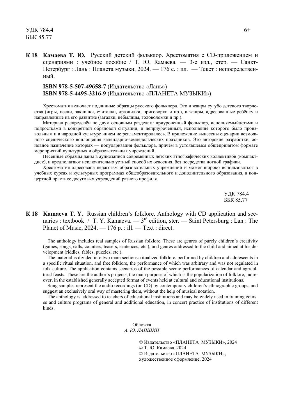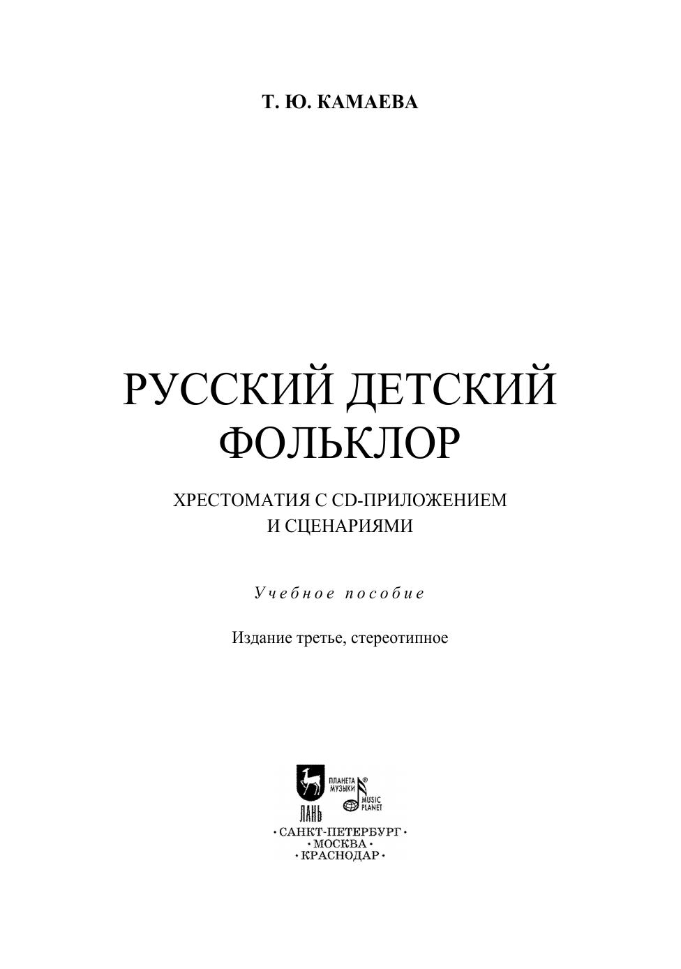 Хрестоматия включает подлинные образцы русского фольклора. Это и жанры сугубо детского творчества (игры, песни, заклички, считалки, дразнилки, приговорки и пр.), и жанры, адресованные ребёнку и направленные на его развитие (загадки, небылицы, головоломки и пр.). Материал распределён по двум основным разделам: приуроченный фольклор, исполняемый детьми и подростками в конкретной обрядовой ситуации, и неприуроченный, исполнение которого было произвольным и в народной культуре ничем не регламентировалось. В приложение вынесены сценарии возможного сценического воплощения календарно-земледельческих праздников. Это авторские разработки, основное назначение которых – популяризация фольклора, причём в устоявшемся общепринятом формате мероприятий культурных и образовательных учреждений. Песенные образцы даны в аудиозаписи современных детских этнографических коллективов (компакт-диск), и предполагают исключительно устный способ их освоения, без посредства нотной графики. Хрестоматия адресована педагогам образовательных учреждений и может широко использоваться в учебных курсах и культурных программах общеобразовательного и дополнительного образования, в концертной практике досуговых учреждений разного профиля. The anthology includes real samples of Russian folklore. These are genres of purely children's creativity (games, songs, calls, counters, teasers, sentences, etc.), and genres addressed to the child and aimed at his development (riddles, fables, puzzles, etc.). The material is divided into two main sections: ritualized folklore, performed by children and adolescents in a specific ritual situation, and free folklore, the performance of which was arbitrary and was not regulated in folk culture. The application contains scenarios of the possible scenic performances of calendar and agricultural feasts. These are the author’s projects, the main purpose of which is the popularization of folklore, moreover, in the established generally accepted format of events held at cultural