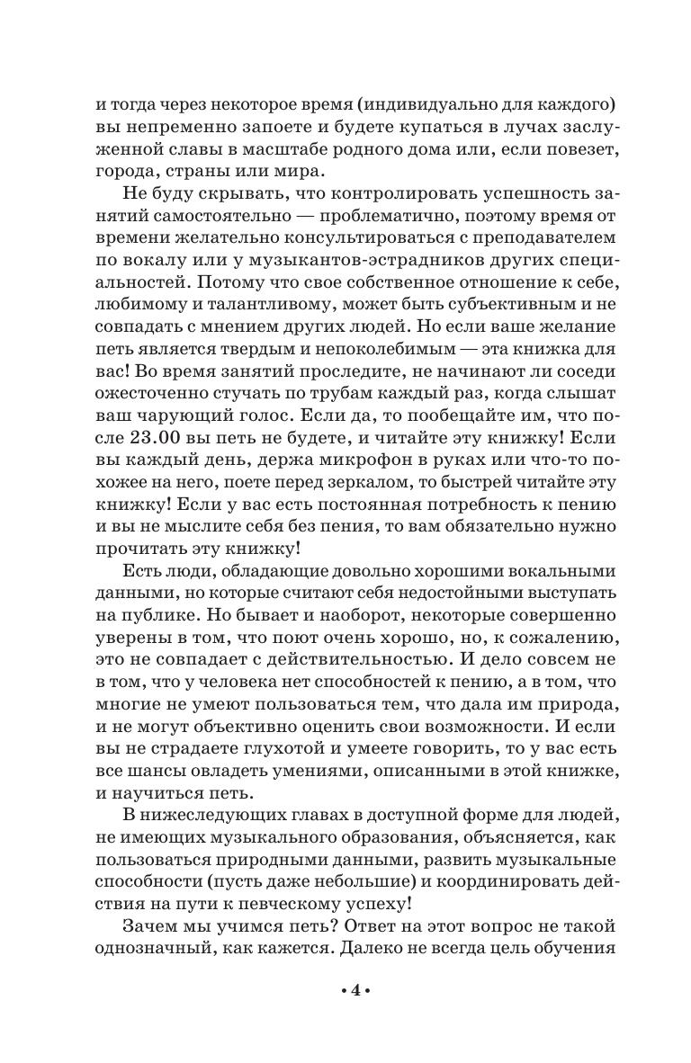 Эта книга для тех, кто хочет научиться петь, но очень сомневается в своих способностях. Автор книги считает и доказывает на практике, что научиться петь может абсолютно любой человек, у кого на то есть большое желание. Желание петь не появляется из ниоткуда! И, если у человека есть желание, то и способность к пению тоже где-то в нем заложена. Проблема в том, что певческие способности человека не всегда находятся на поверхности, и зачастую их непросто отыскать в глубинах человеческой натуры. В 2006 году вышла первая книжка автора о пении. Тогда трудно было прогнозировать, смогут ли читатели научится петь без педагога, только читая книгу? Но прошло время и стало понятно, что это возможно! Среди читателей этого автора есть такие, кто смог поступить в музыкальный ВУЗ на эстрадный вокал, только лишь изучив книгу, сейчас это профессиональные вокалисты! В этой книге в доступной форме, для людей, не имеющих музыкального образования, объясняется, как пользоваться природными данными, развить музыкальные способности (пусть даже небольшие) и координировать свои действия на пути к певческому успеху! В этой книге вы откроете для себя много новой и полезной информации, которая окажется вам нужна не только для овладения своим голосом, но и в других сферах вашей жизни. И даже, если петь не ваше призвание, то, читая книгу, вы научитесь ясно и четко говорить, держать спину прямой, правильно дышать, быть уверенным в себе, спокойно держаться на большой аудитории и многому другому. Приятного прочтения!