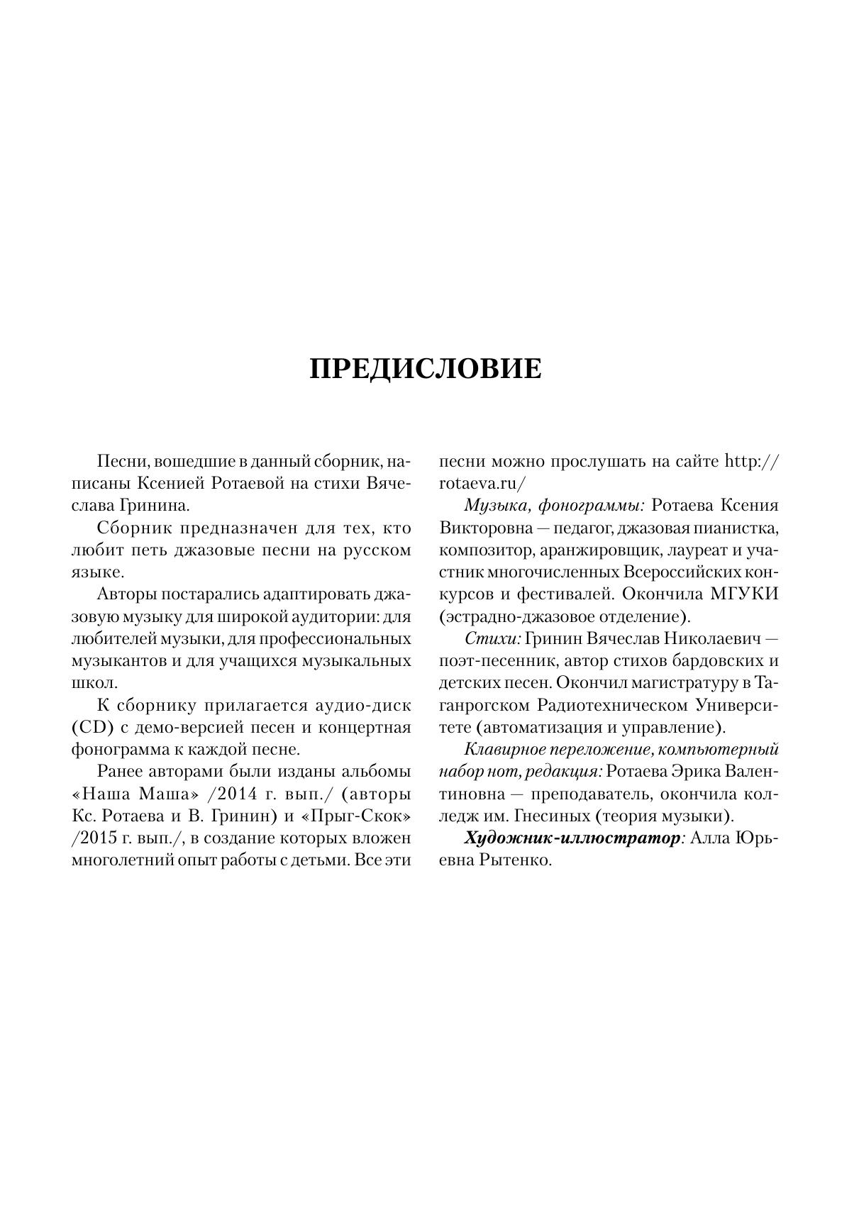 Сборник предназначен для тех, кто любит петь джазовые песни на русском языке. Авторы постарались адаптировать джазовую музыку для широкой аудитории: для любителей музыки, для профессиональных музыкантов и для учащихся музыкальных школ. К сборнику прилагается аудиодиск (CD) с концертными фонограммами всех песен, и демо-проигрывание нот каждого произведения.
