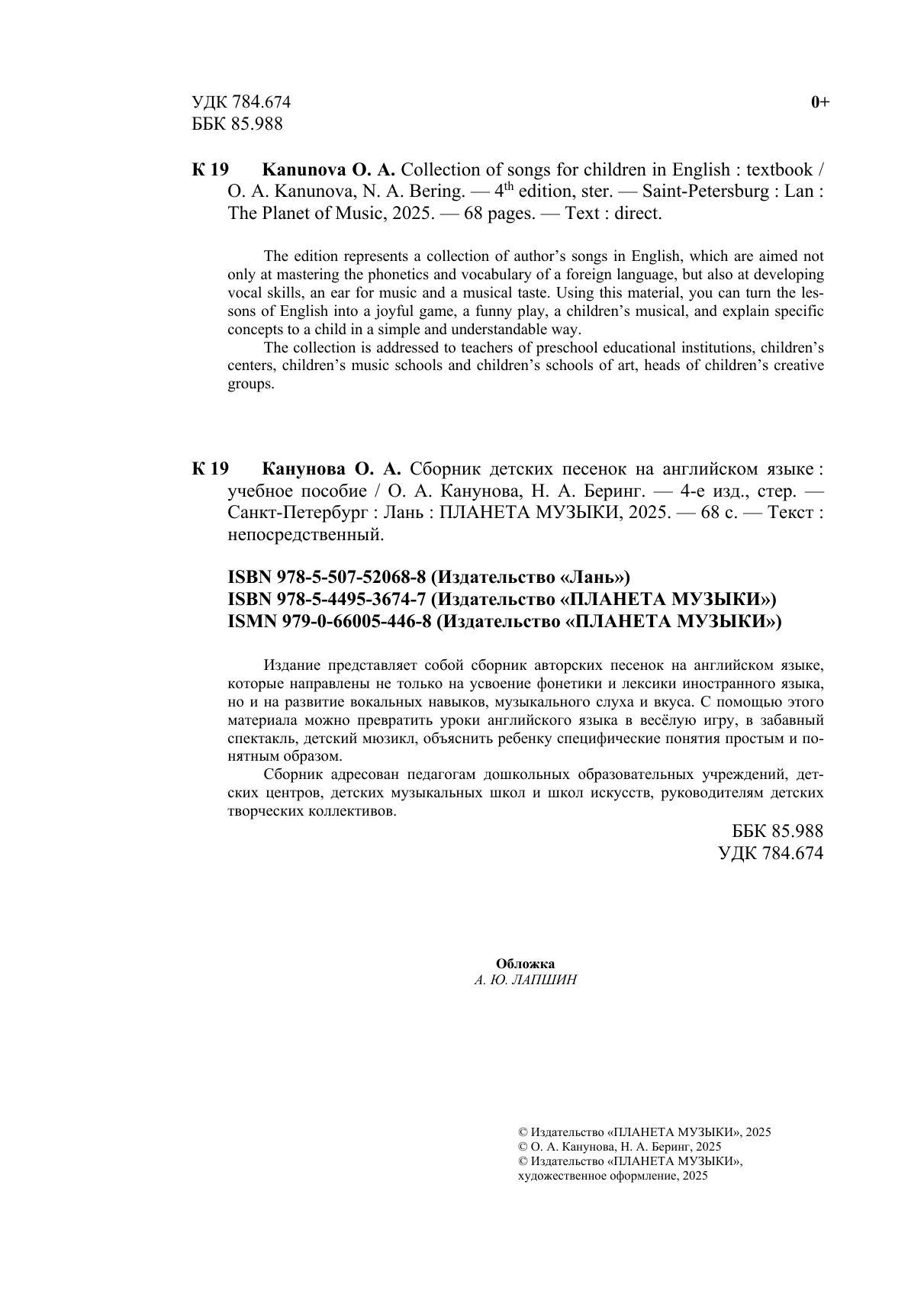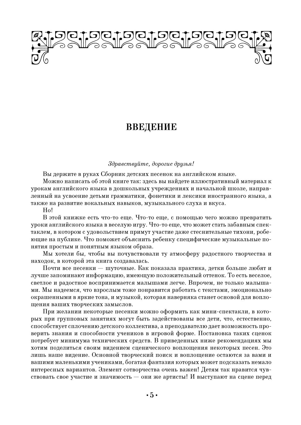 Издание представляет собой сборник авторских песенок на английском языке, которые направлены не только на усвоение фонетики и лексики иностранного языка, но и на развитие вокальных навыков, музыкального слуха и вкуса. С помощью этого материала можно превратить уроки английского языка в весёлую игру, в забавный спектакль, детский мюзикл, объяснить ребенку специфические понятия простым и понятным образом. Сборник адресован педагогам дошкольных образовательных учреждений, детских центров, детских музыкальных школ и школ искусств, руководителям детских творческих коллективов.