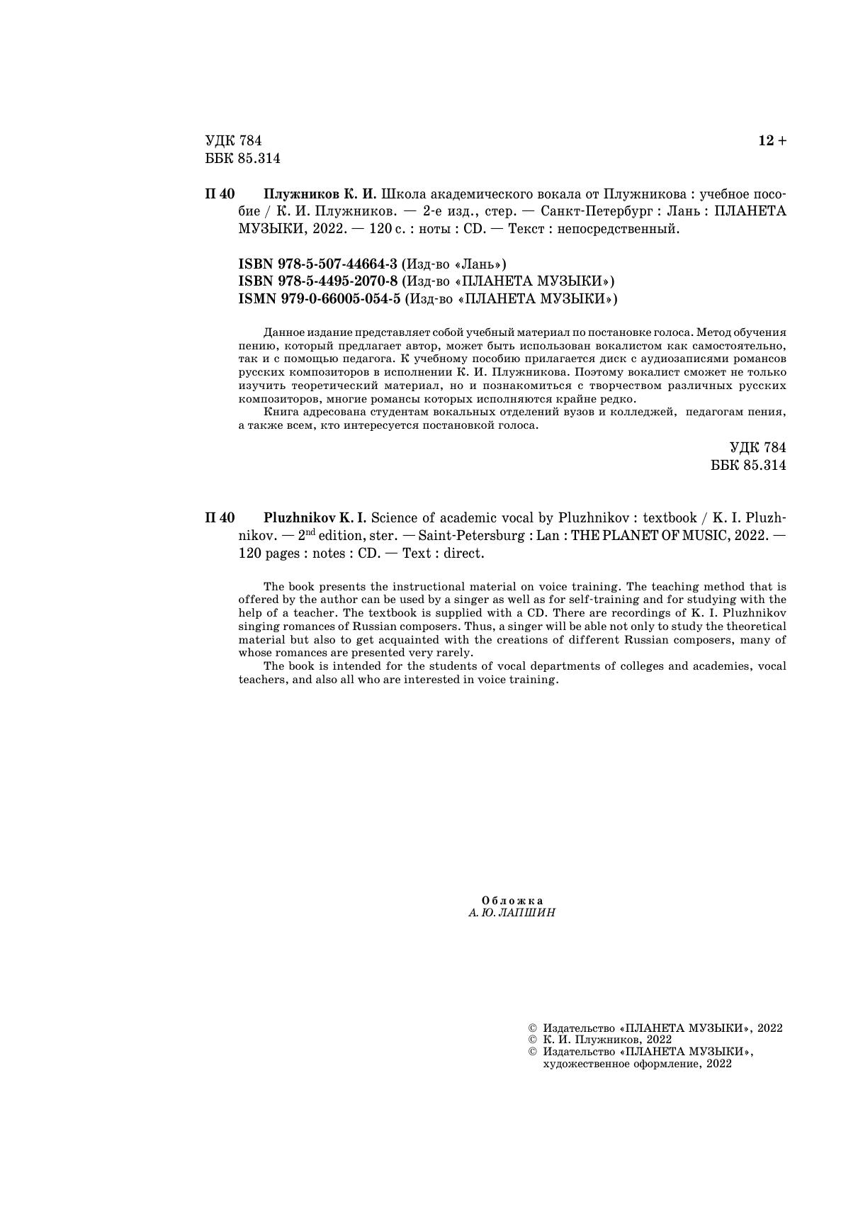 Данное издание представляет собой учебный материал по постановке голоса. Метод обучения пению, который предлагает автор, может быть использован вокалистом как самостоятельно, так и с помощью педагога. К учебному пособию прилагается диск с аудио-записями романсов русских композиторов в исполнении К. И. Плужникова. Поэтому вокалист сможет не только изучить теоретический материал, но и познакомиться с творчеством различных русских композиторов, многие романсы которых исполняются крайне редко.