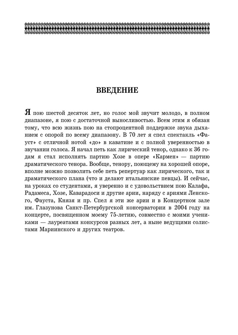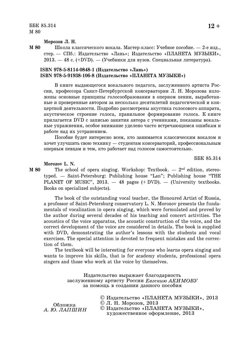 В книге выдающегося вокального педагога, заслуженного артиста России, профессора Санкт-Петербургской консерватории Л. Н. Морозова изложены основные принципы голосообразования в оперном пении, выработанные и проверенные автором за несколько десятилетий педагогической и концертной деятельности. Подробно рассмотрены акустика голосового аппарата, акустическое строение голоса, правильное формирование голоса. К книге прилагается DVD с записью занятия автора с учениками, показаны вокальные упражнения, особое внимание уделено часто встречающимся ошибкам и работе над их устранением.