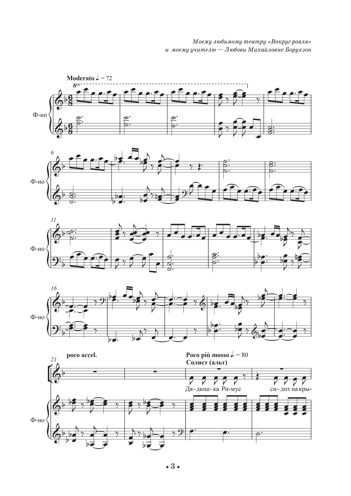 Музыкальный спектакль «Сказка Дядюшки Римуса» может быть разыгран как любителями, так и учениками музыкальной школы, поставлен в театральном кружке или взрослом профессиональном театре. Разнообразные, яркие типажи, несколько сольных партий, конфликтные ситуации и много юмора, запоминающаяся музыка, сближают спектакль с жанром мюзикла. Все это должно понравиться как детям, так и взрослым.