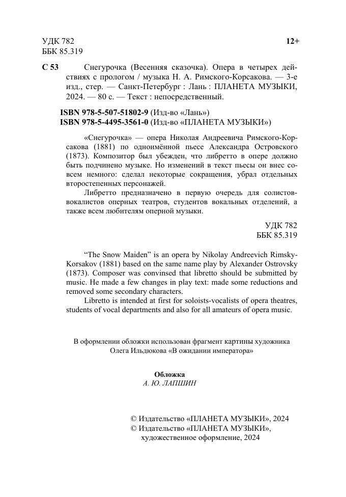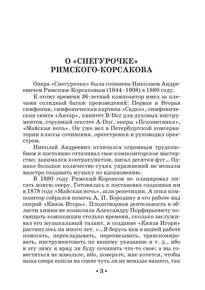 «Снегурочка» — опера Николая Андреевича Римского-Корсакова (1881) по одноимённой пьесе Александра Островского (1873). Композитор был убежден, что либретто в опере должно быть подчинено музыке. Но изменений в текст пьесы он внес совсем не много: сделал некоторые сокращения, убрал отдельных второстепенных персонажей.Либретто предназначено в первую очередь для солистов-вокалистов оперных театров, студентов вокальных отделений, а также всем любителям оперной музыки.