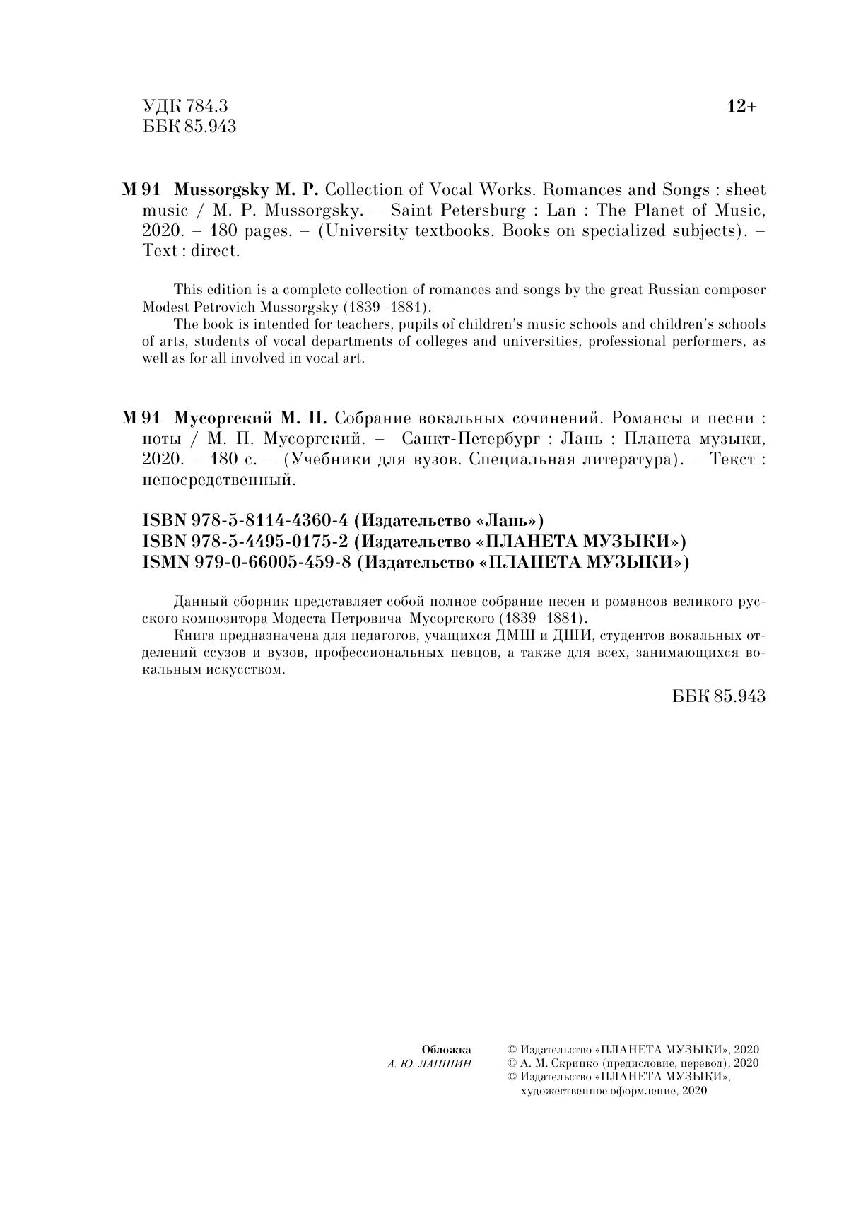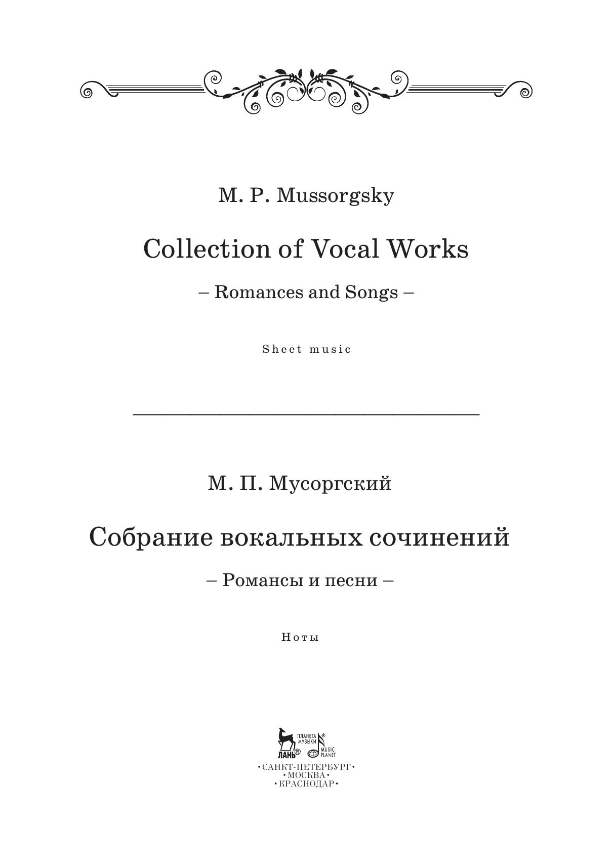 Данный сборник представляет собой полное собрание песен и романсов великого русского композитора Модеста Петровича Мусоргского (1839-1881).