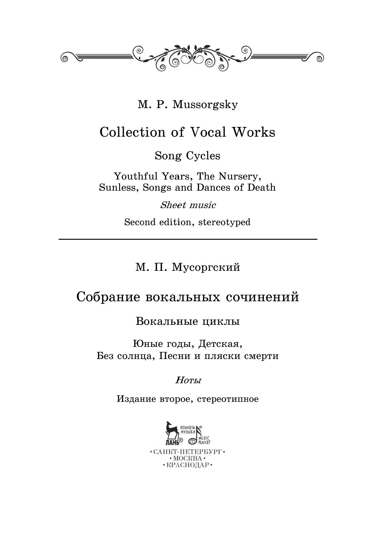 Данный сборник представляет собой полное собрание вокальных циклов великого русского композитора Модеста Петровича Мусоргского (1839-1881).