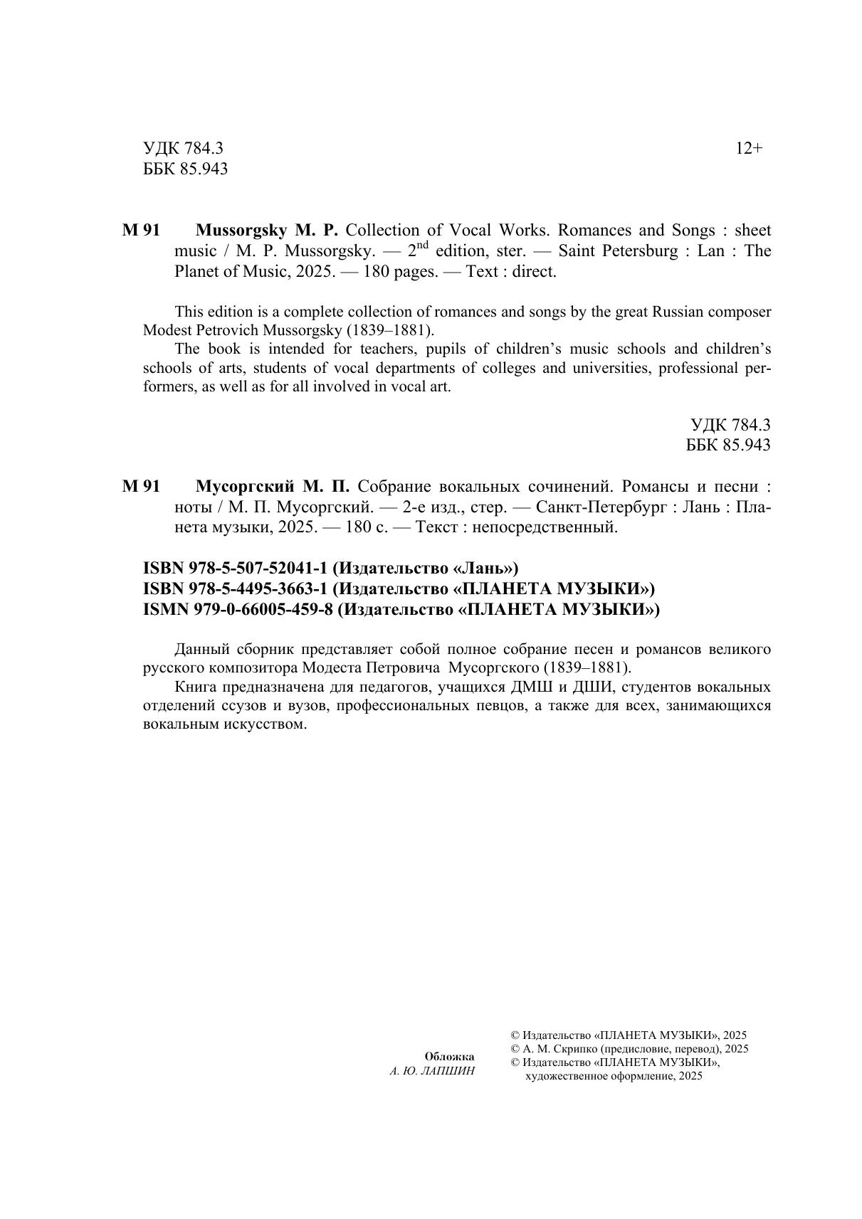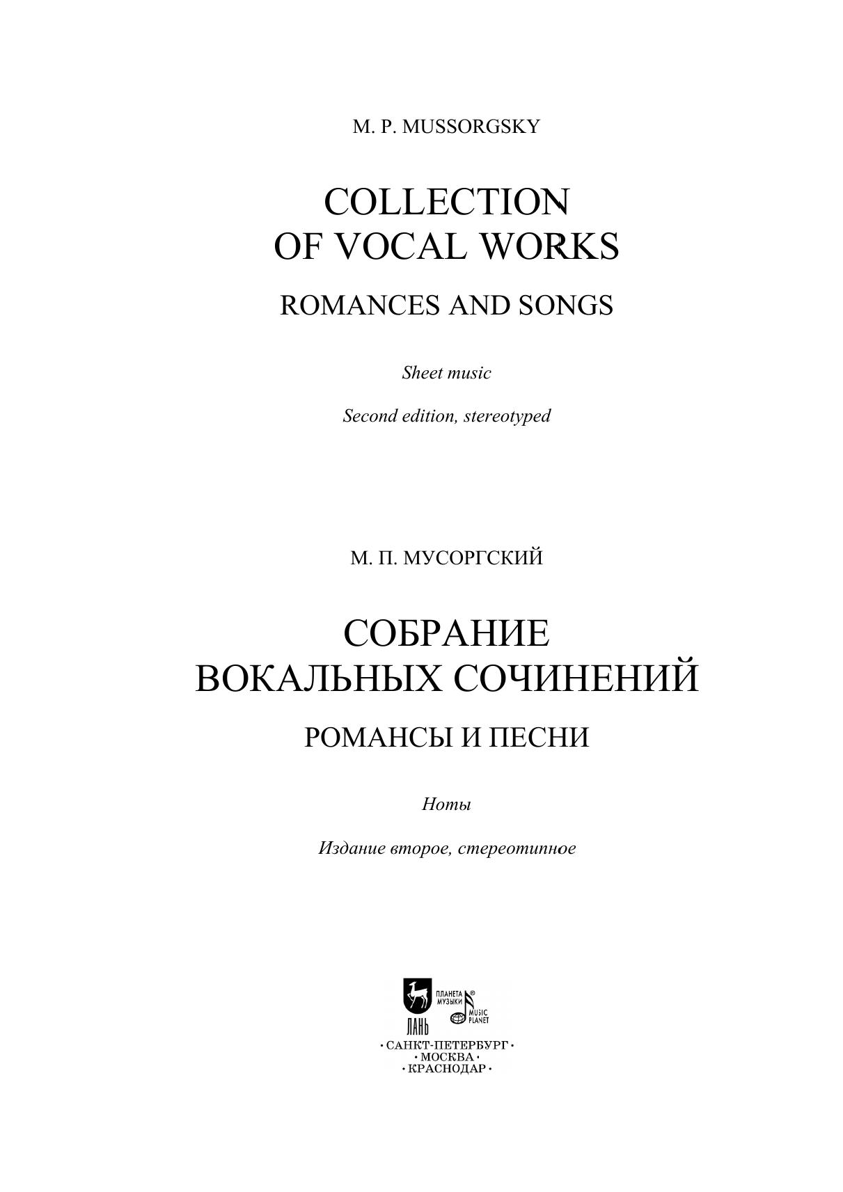 Данный сборник представляет собой полное собрание песен и романсов великого русского композитора Модеста Петровича Мусоргского (1839-1881). Книга предназначена для педагогов, учащихся ДМШ и ДШИ, студентов вокальных отделений ссузов и вузов, профессиональных певцов, а также для всех, занимающихся вокальным искусством.
