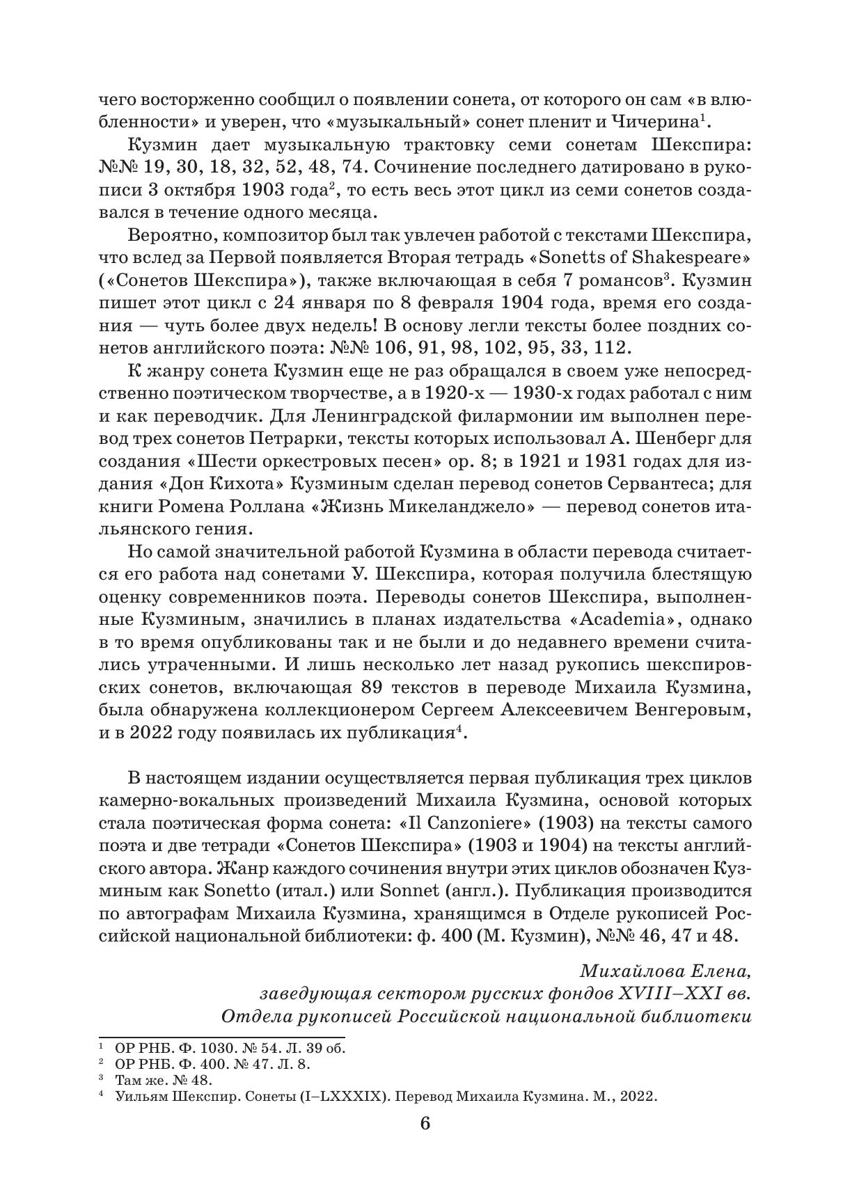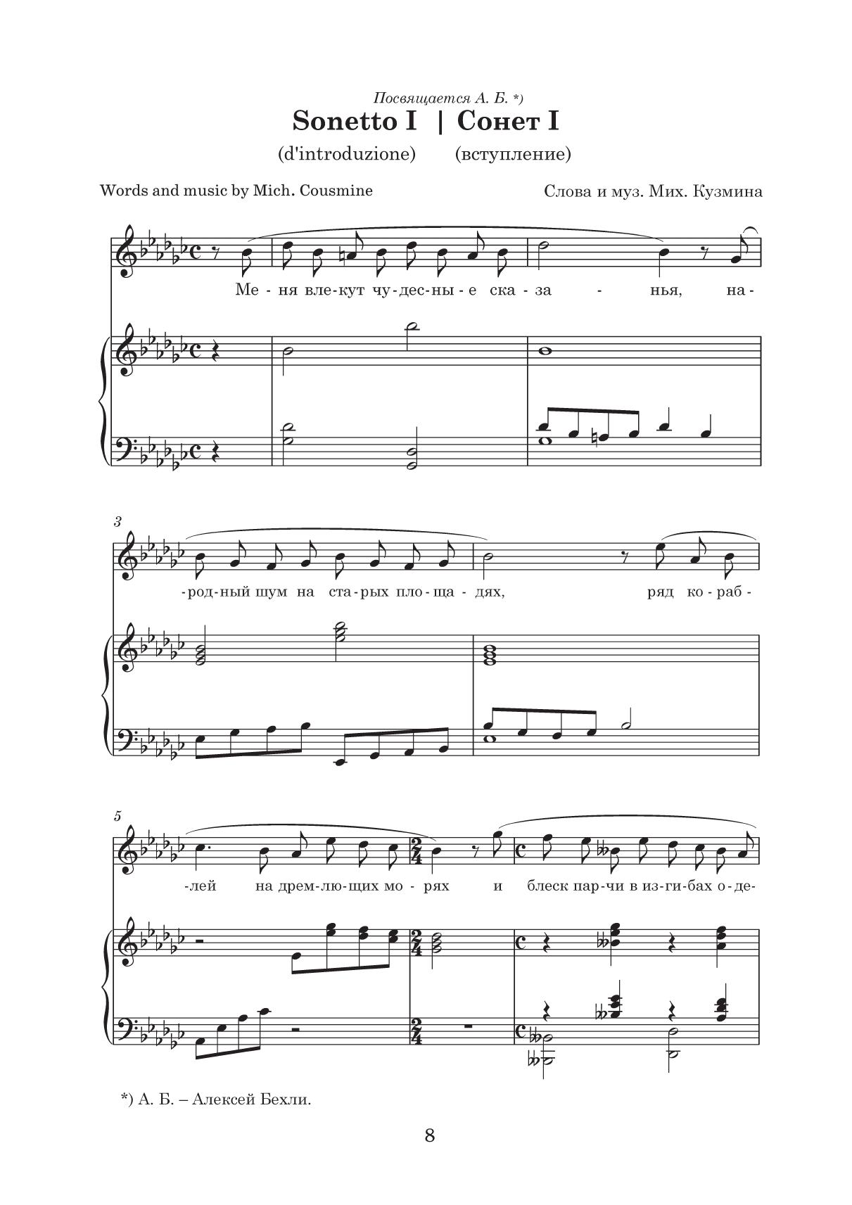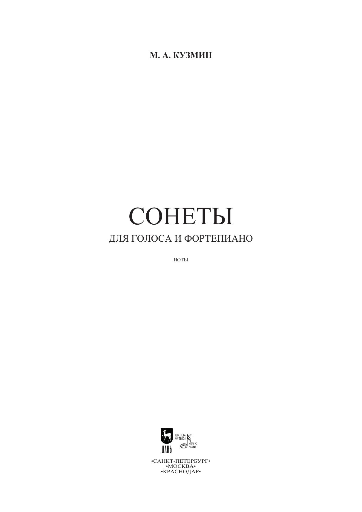 Михаил Алексеевич Кузмин (1872–1936) — русский поэт, прозаик, драматург, переводчик, критик и композитор Серебряного века, первый в России мастер свободного стиха. В настоящем издании впервые публикуются три камерно-вокальных цикла Кузмина: «Il Canzoniere» на стихи самого автора и две тетради Сонетов Шекспира («Sonnets of Shakespeare») на оригинальные тексты английского поэта. Публикация осуществляется по автографам, хранящимся в Российской национальной библиотеке (ОР РНБ. Ф. 400. № 46–48). Mikhail Alexeevich Kuzmin (1872–1936) was a Russian poet, prose writer, playwright, translater, critic and composer of the Silver Age, the first master of vers libre in Russia. The current edition presents for the first time three chamber vocal cycles by Kuzmin: “Il Canzoniere” to author’s lyrics and two books of Sonnets of Shakespeare to original poems by the English poet. The edition is carried out according to autographs stored in Russian National Library (Department of manuscripts at RNL. F. 400. № 46–48).
