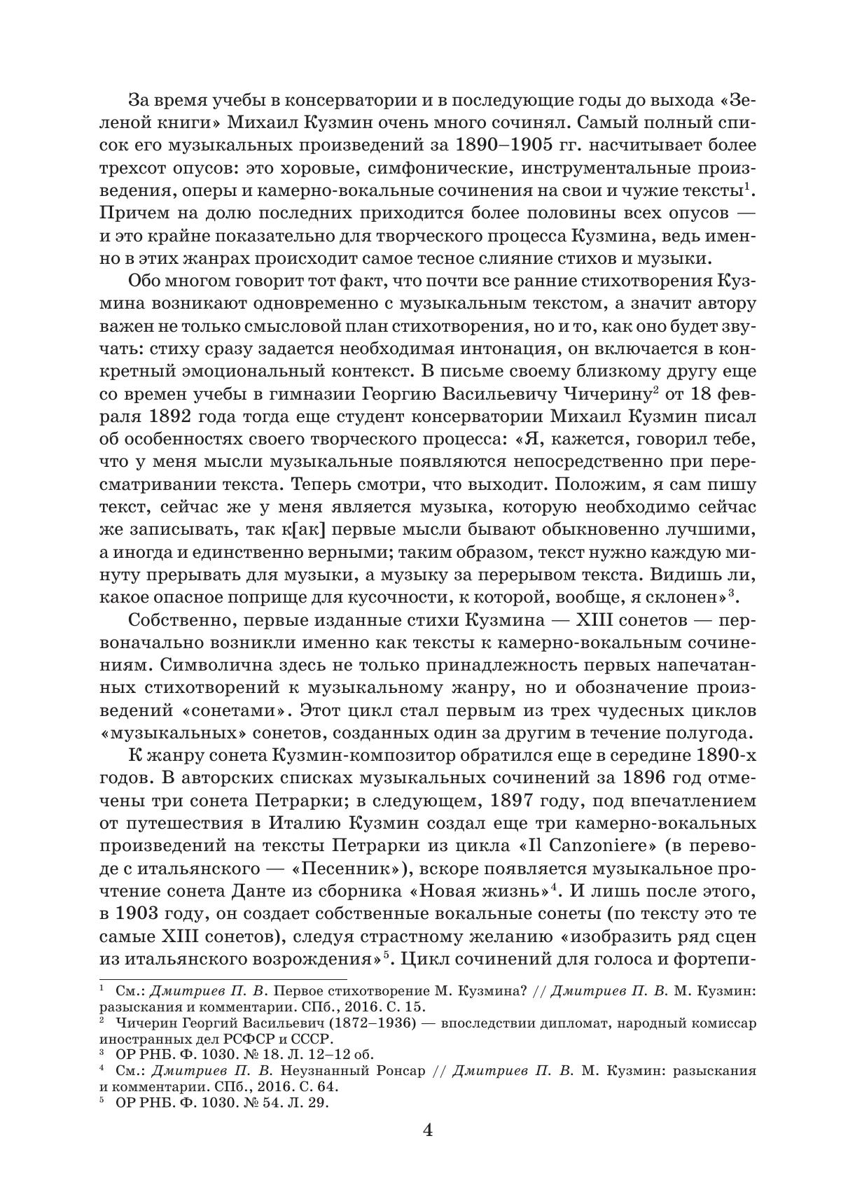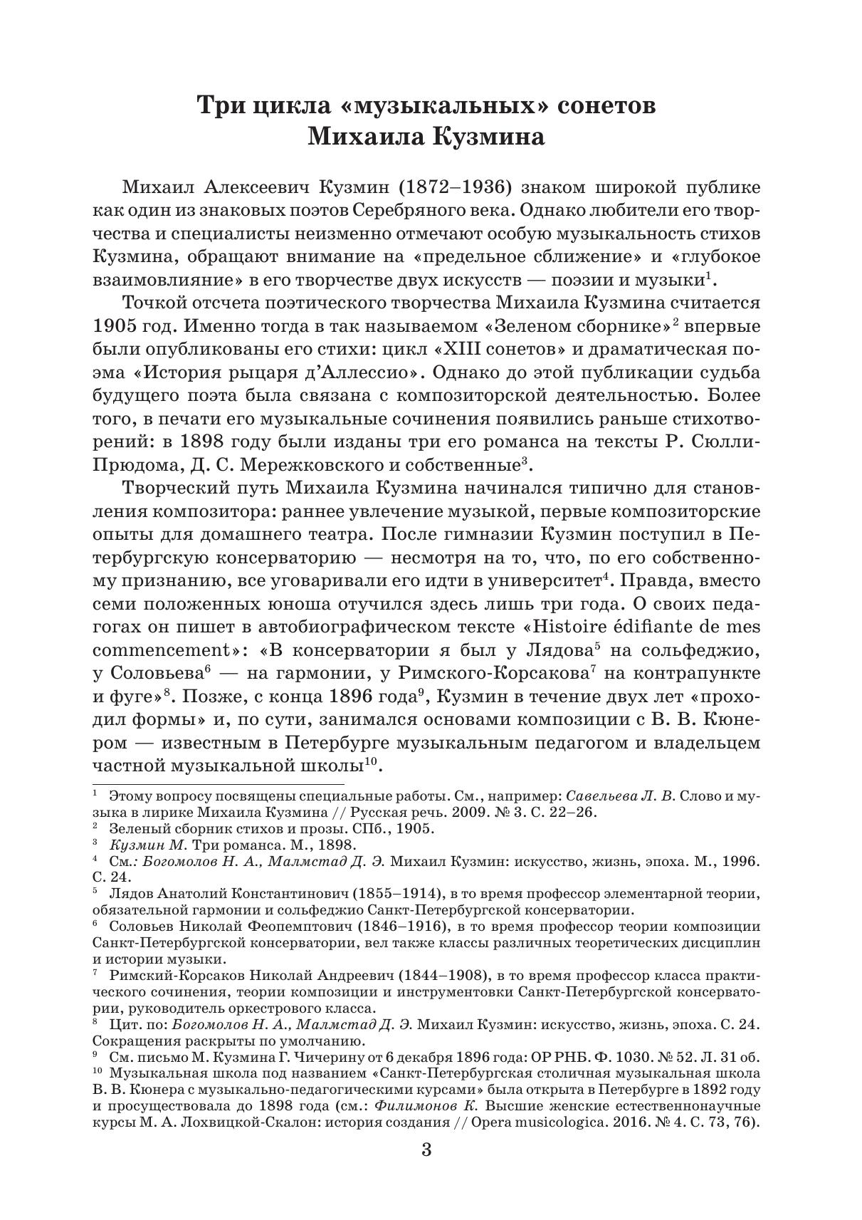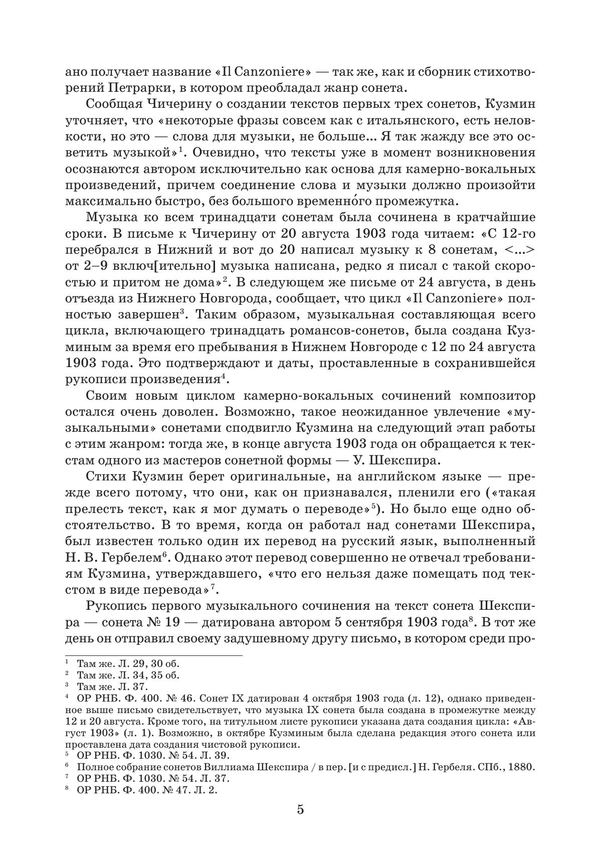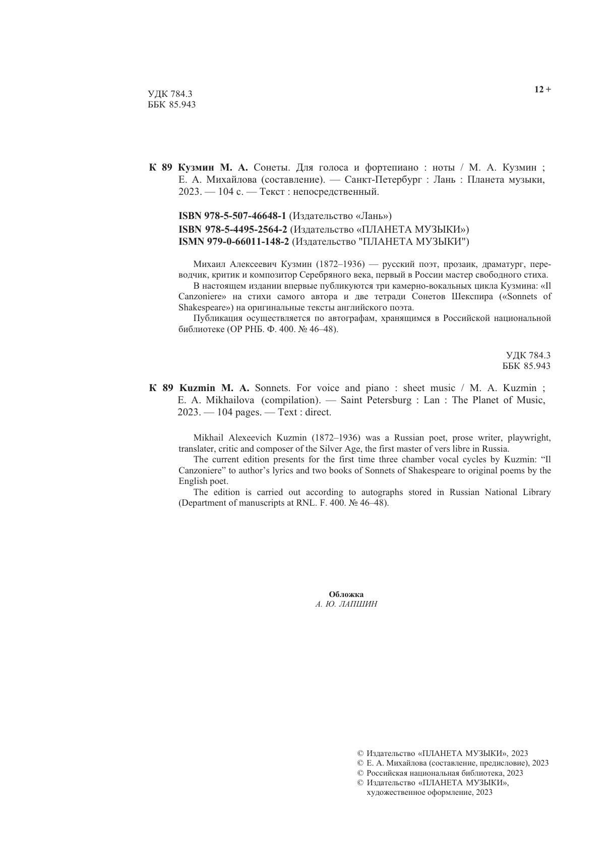 Михаил Алексеевич Кузмин (1872–1936) — русский поэт, прозаик, драматург, переводчик, критик и композитор Серебряного века, первый в России мастер свободного стиха. В настоящем издании впервые публикуются три камерно-вокальных цикла Кузмина: «Il Canzoniere» на стихи самого автора и две тетради Сонетов Шекспира («Sonnets of Shakespeare») на оригинальные тексты английского поэта. Публикация осуществляется по автографам, хранящимся в Российской национальной библиотеке (ОР РНБ. Ф. 400. № 46–48). Mikhail Alexeevich Kuzmin (1872–1936) was a Russian poet, prose writer, playwright, translater, critic and composer of the Silver Age, the first master of vers libre in Russia. The current edition presents for the first time three chamber vocal cycles by Kuzmin: “Il Canzoniere” to author’s lyrics and two books of Sonnets of Shakespeare to original poems by the English poet. The edition is carried out according to autographs stored in Russian National Library (Department of manuscripts at RNL. F. 400. № 46–48).