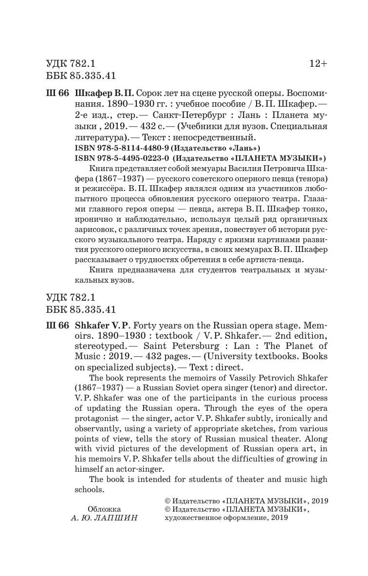 Книга представляет собой мемуары Василия Петровича Шкафера (1867–1937) — русского советского оперного певца (тенора) и режиссёра. В. П. Шкафер являлся одним из участников любопытного процесса обновления русского оперного театра. Глазами главного героя оперы — певца, актера В. П. Шкафер тонко, иронично и наблюдательно, используя целый ряд органичных зарисовок, c различных точек зрения, повествует об истории русского музыкального театра. Наряду с яркими картинами развития русского оперного искусства, в своих мемуарах В. П. Шкафер рассказывает о трудностях обретения в себе артиста-певца.