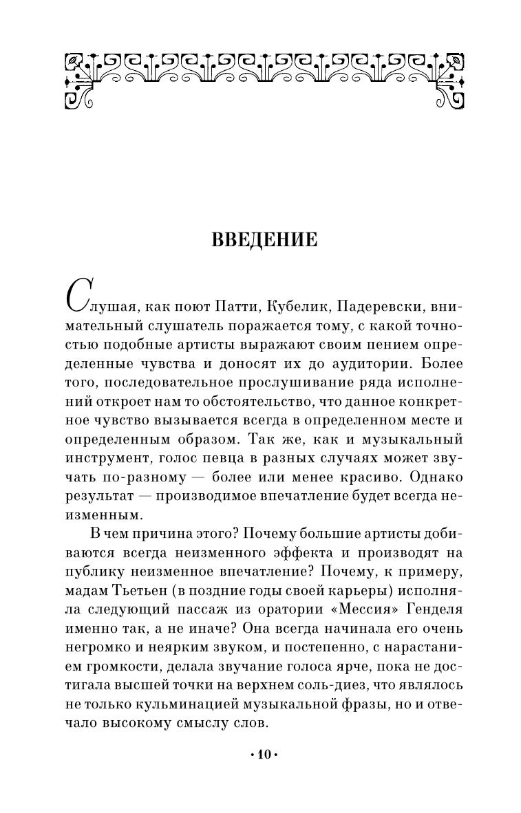 В книге подробно рассматриваются основные элементы обучения певца, говорится об эмиссии голоса, приемах вокальной техники, окраске звука, динамике, фразировке. Особое внимание уделяется анализу стиля и манеры вокального исполнения на примерах из произведений Генделя, Глюка, Моцарта, Верди и др. композиторов. Всего в книге – более ста нотных примеров.