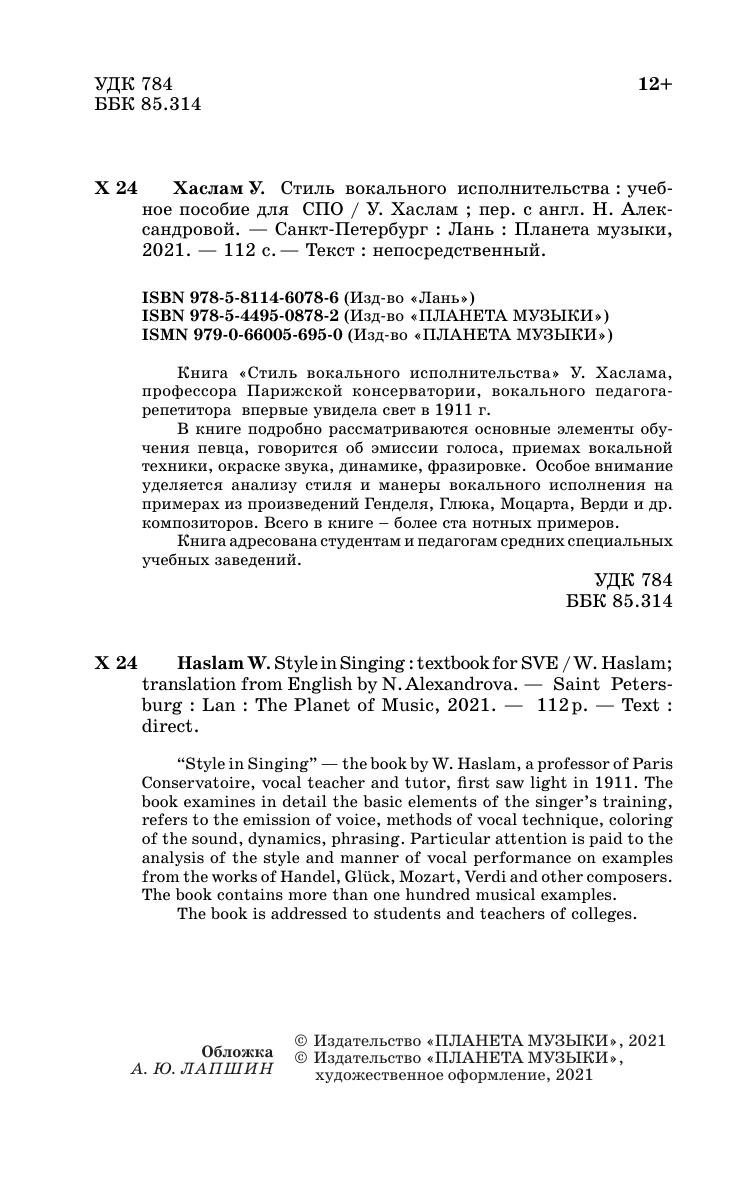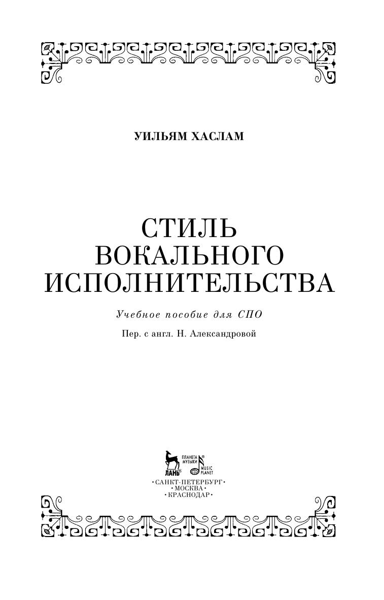 Книга «Стиль вокального исполнительства» У. Хаслама, профессора Парижской консерватории, вокального педагога-репетитора впервые увидела свет в 1911 г.