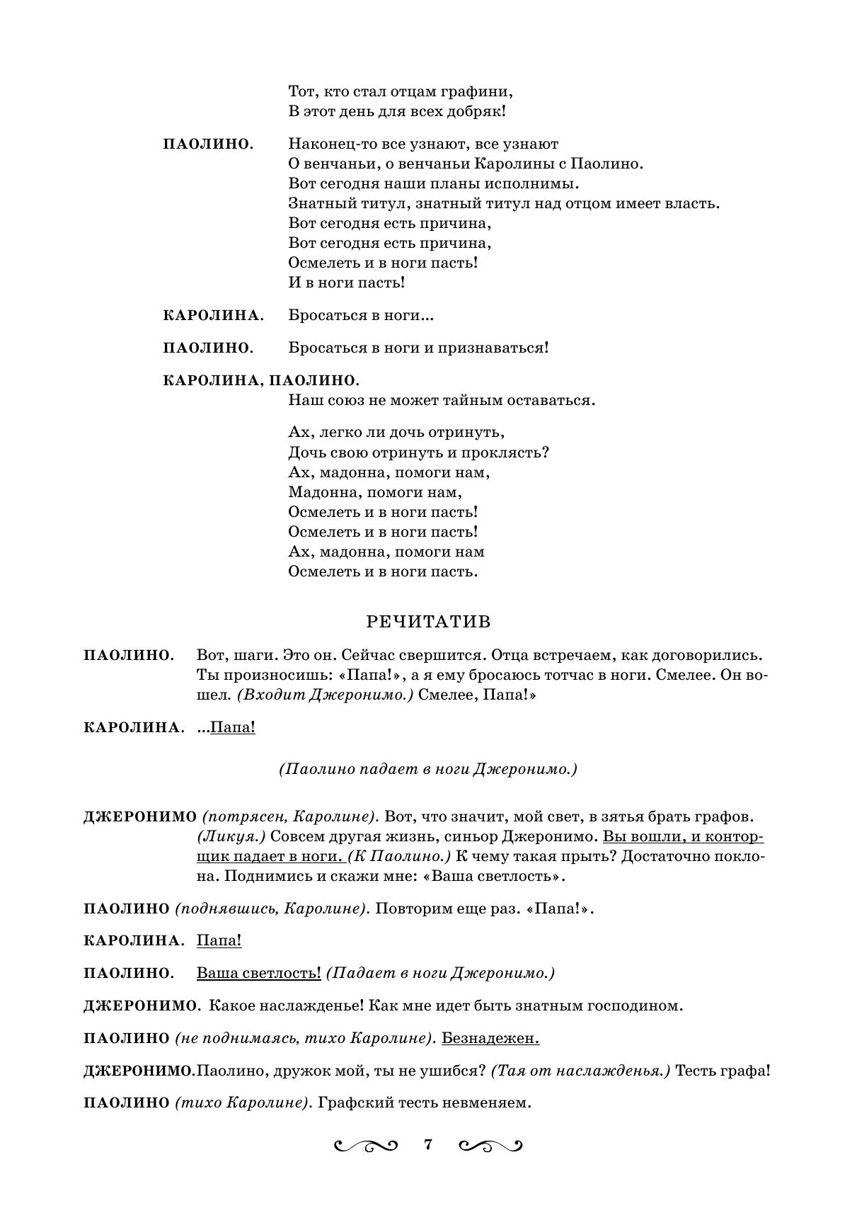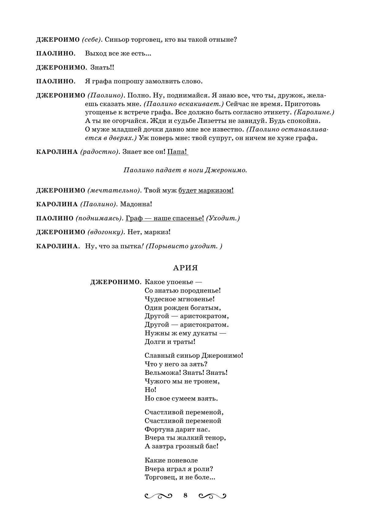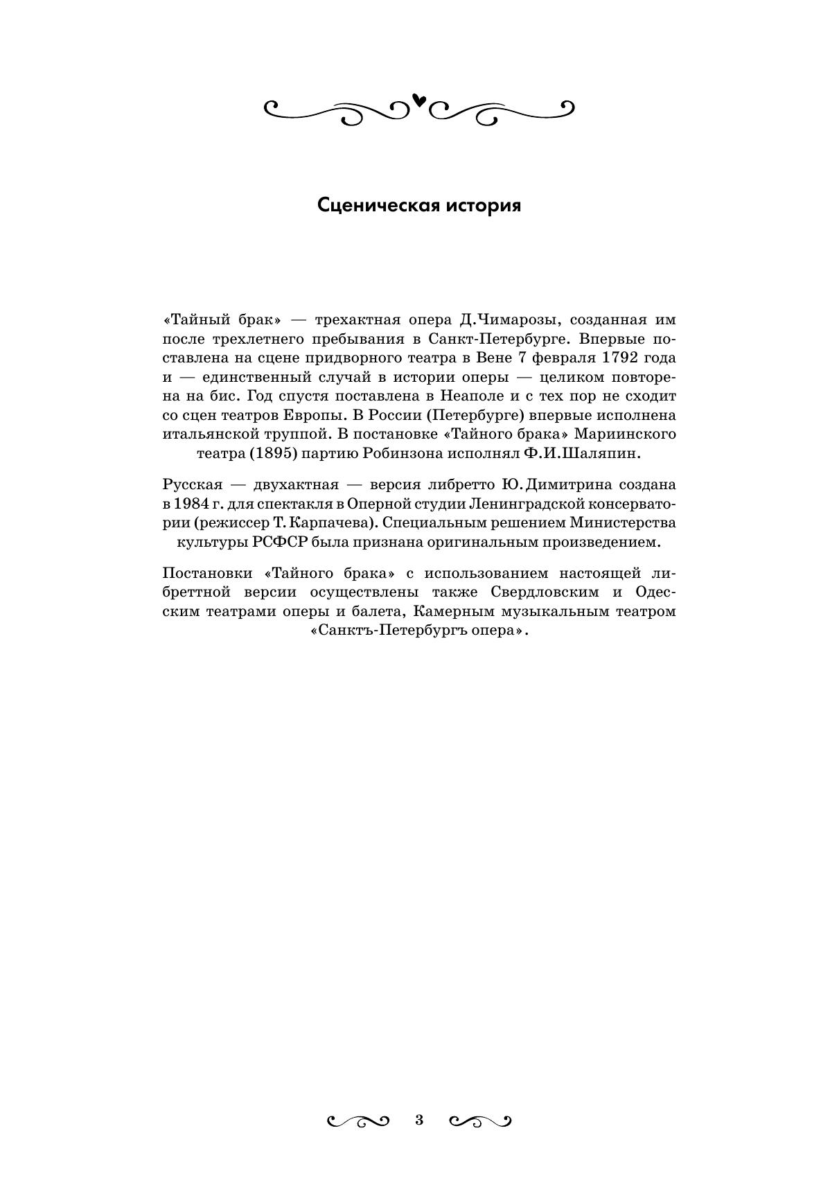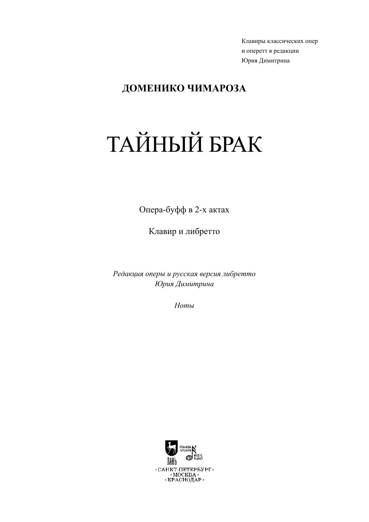 Опера-буфф Чимарозы «Тайный брак» одна из самых распрострненных комедийных опер на мировой музыкальной сцене. Клавир издается на русском языке в редакции Юрия Димитрина. Издание, включающее в себя клавир и либретто, предназначено для дирижеров, режиссеров и солистов музыкальных театров, для студентов и педагогов вокальных отделений творческих вузов, а также для широкого круга любителей музыкально-сценического искусства. Opera buffa “The Secret Marriage” (“Il matrimonio segreto”) by Domenico Cimarosa is one of the most popular comical operas on the world music stage. The score is published in Russian, edited by Yuri Dimitrin. The edition, which includes the piano score and libretto, is intended for conductors, directors and soloists of music theatres, for students and teachers of vocal departments of higher schools of arts, as well as for a wide range of lovers of musical and performing arts.