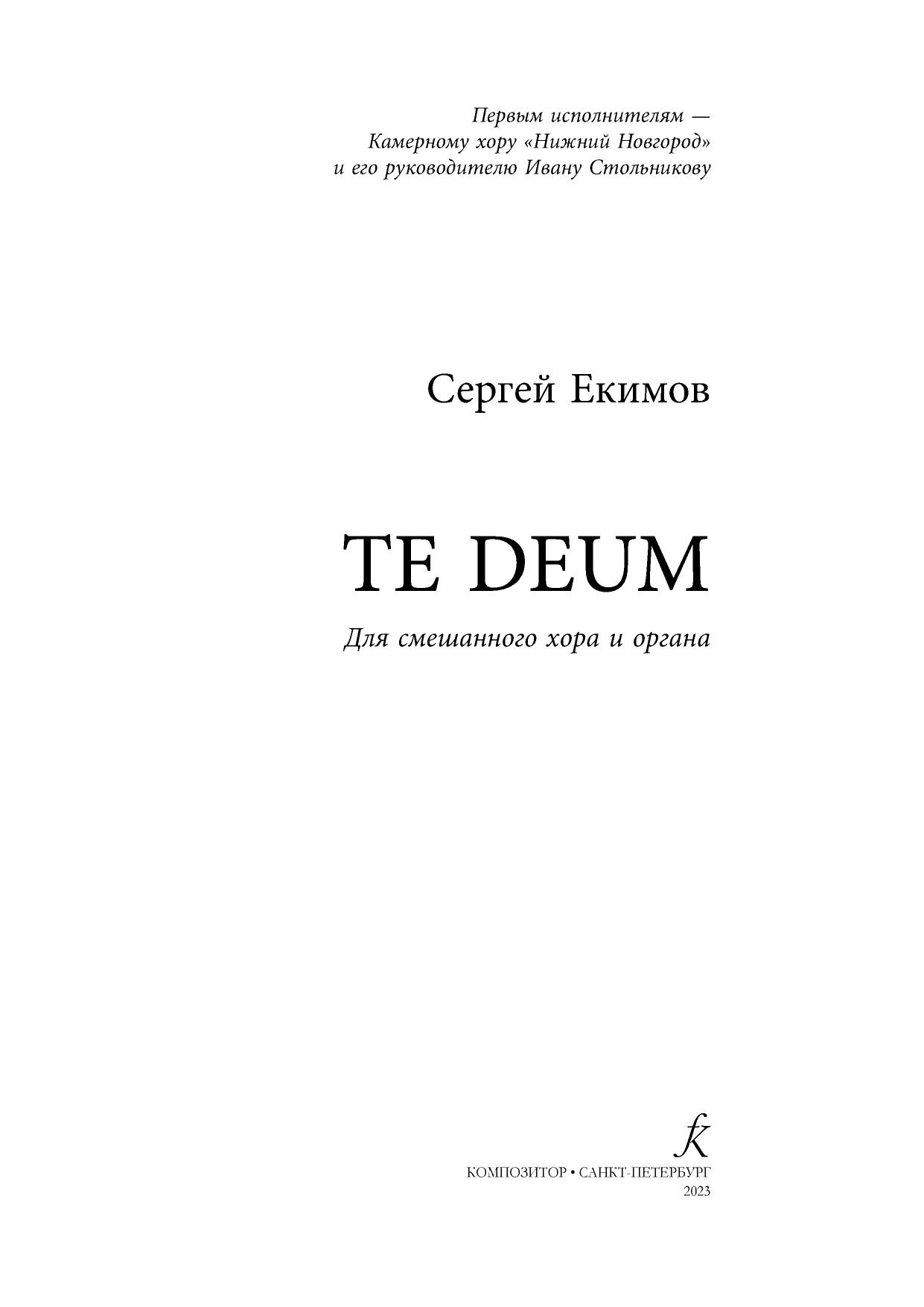 Предлагаемое сочинение известного петербургского композитора, хорового дирижёра и педагога Сергея Екимова (р. 1974) появилось благодаря творческой дружбе автора с Муниципальным камерным хором «Нижний Новгород» под управлением Ивана Стольникова. Сочинение было закончено 3 октября 2021 года; мировая премьера состоялась уже 24 октября в Большом зале Нижегородской консерватории им. М. И. Глинки, а затем этот опус прозвучал 31 октября того же года в Органном зале Пермской филармонии на концерте-открытии XVI Международного фестиваля органной музыки, для которого он и был написан. Последние по времени обращения композитора к музыке на латинские тексты для хора и органа датируются концом 1990-х — началом 2000-х годов: это «Пять католических песнопений» для сопрано и органа (1998–1999) и «Stabat Mater» для солистов, двух хоров, органа, струнного оркестра и ударных (2002). «Тe Deum» — яркое, красочное, эффектное сочинение для смешанного хора в сопровождении органа; последнему поручается в основном аккомпанирующая роль, но на кульминации соло отдано именно королю инструментов. Музыкальная ткань включает небольшие эпизодические высказывания солистов-вокалистов, которые вполне могут исполняться отдельными участниками хора.