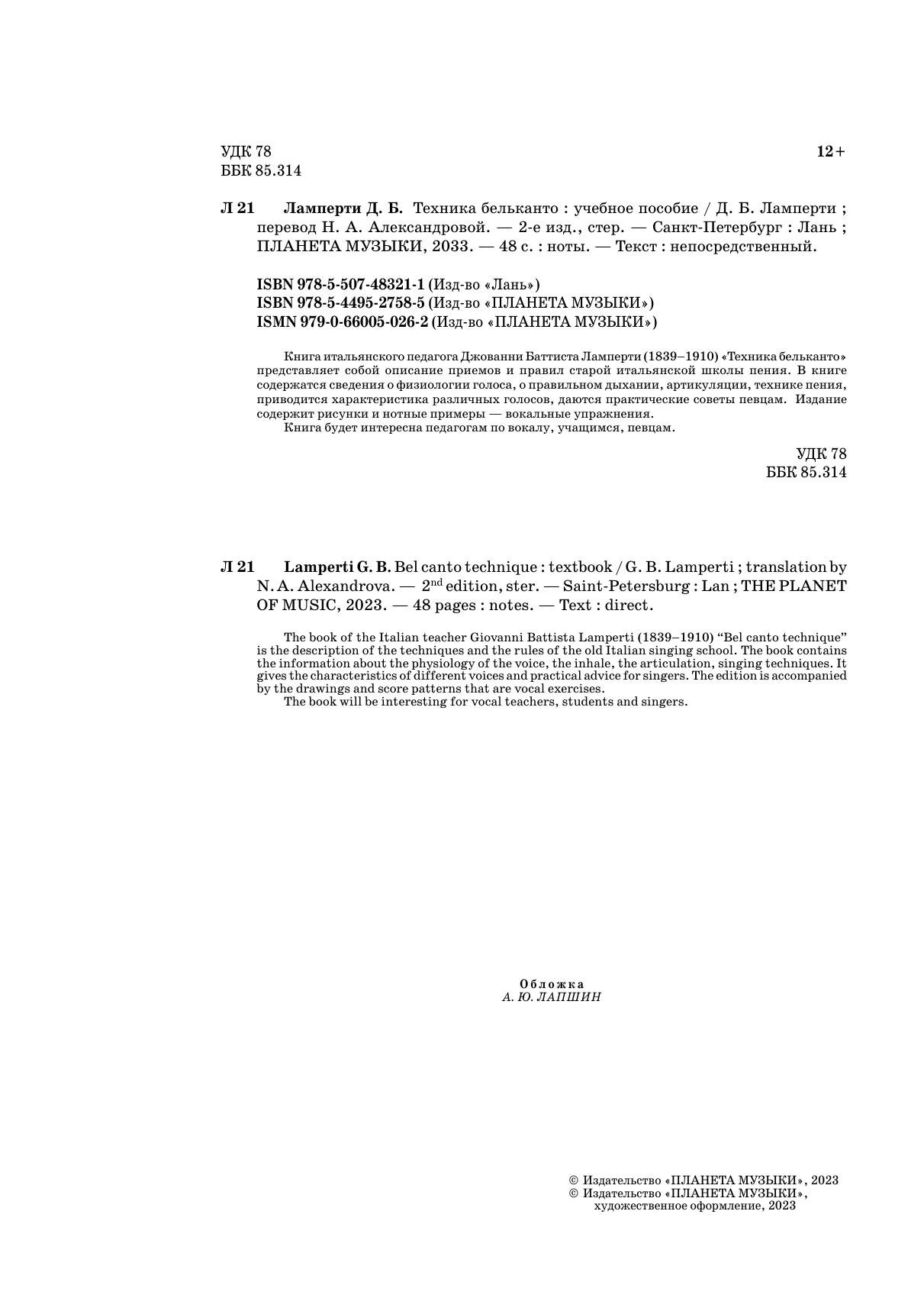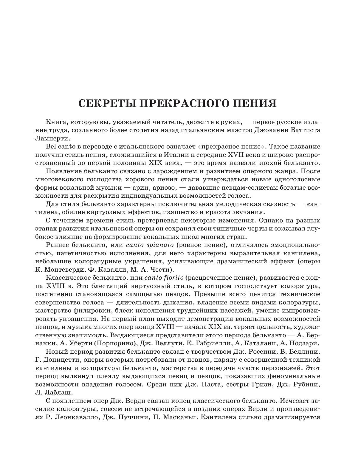 Книга итальянского педагога Джованни Баттиста Ламперти (1839-1910) "Техника бельканто" представляет собой описание приемов и правил старой итальянской школы пения. В книге содержатся сведения о физиологии голоса, о правильном дыхании, артикуляции, технике пения, приводится характеристика различных голосов, даются практические советы певцам. Издание содержит рисунки и нотные примеры - вокальные упражнения.Книга будет интересна педагогам по вокалу, учащимся, певцам.