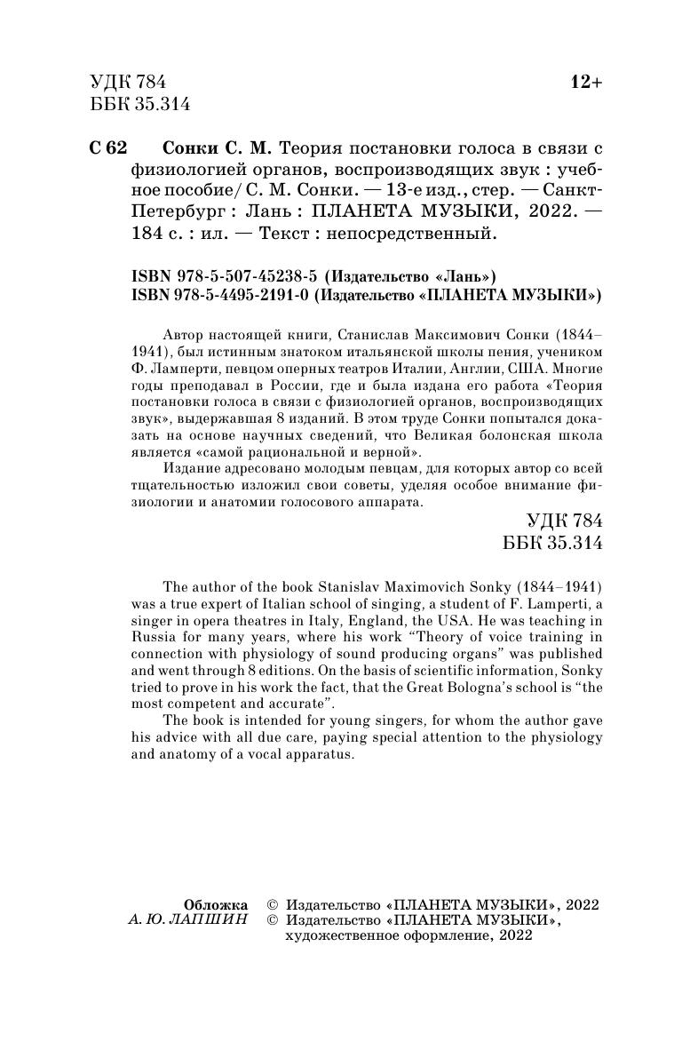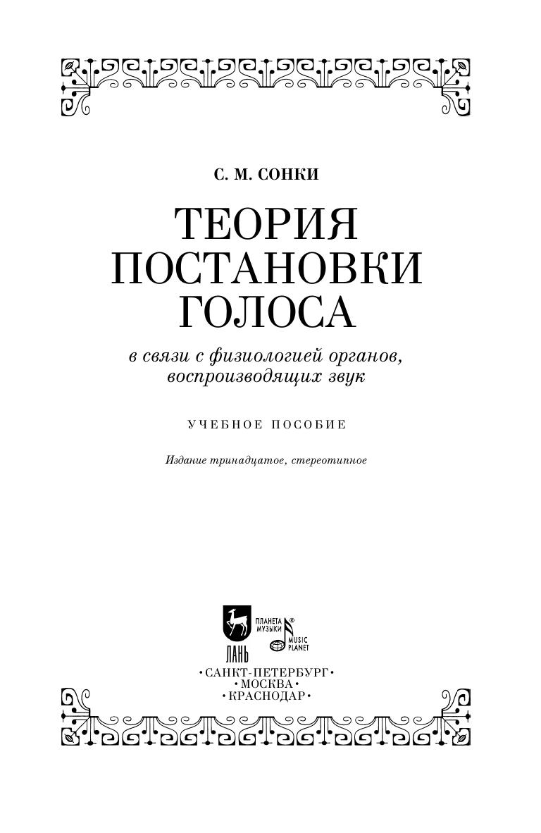 Автор настоящей книги, Станислав Максимович Сонки (1844-1941), был истинным знатоком Итальянской школы пения, учеником Ф. Ламперти, певцом оперных театров Италии, Англии, США. Многие годы преподавал в России, где и была издана его работа «Теория постановки голоса в связи с физиологией органов, воспроизводящих звук», выдержавшая 8 изданий. В этом труде Сонки попытался доказать на основе научных сведений, что Великая Болонская школа является «самой рациональной и верной». Издание адресовано молодым певцам, для которых автор со всей тщательностью изложил свои советы, уделяя особое внимание физиологии и анатомии голосового аппарата.