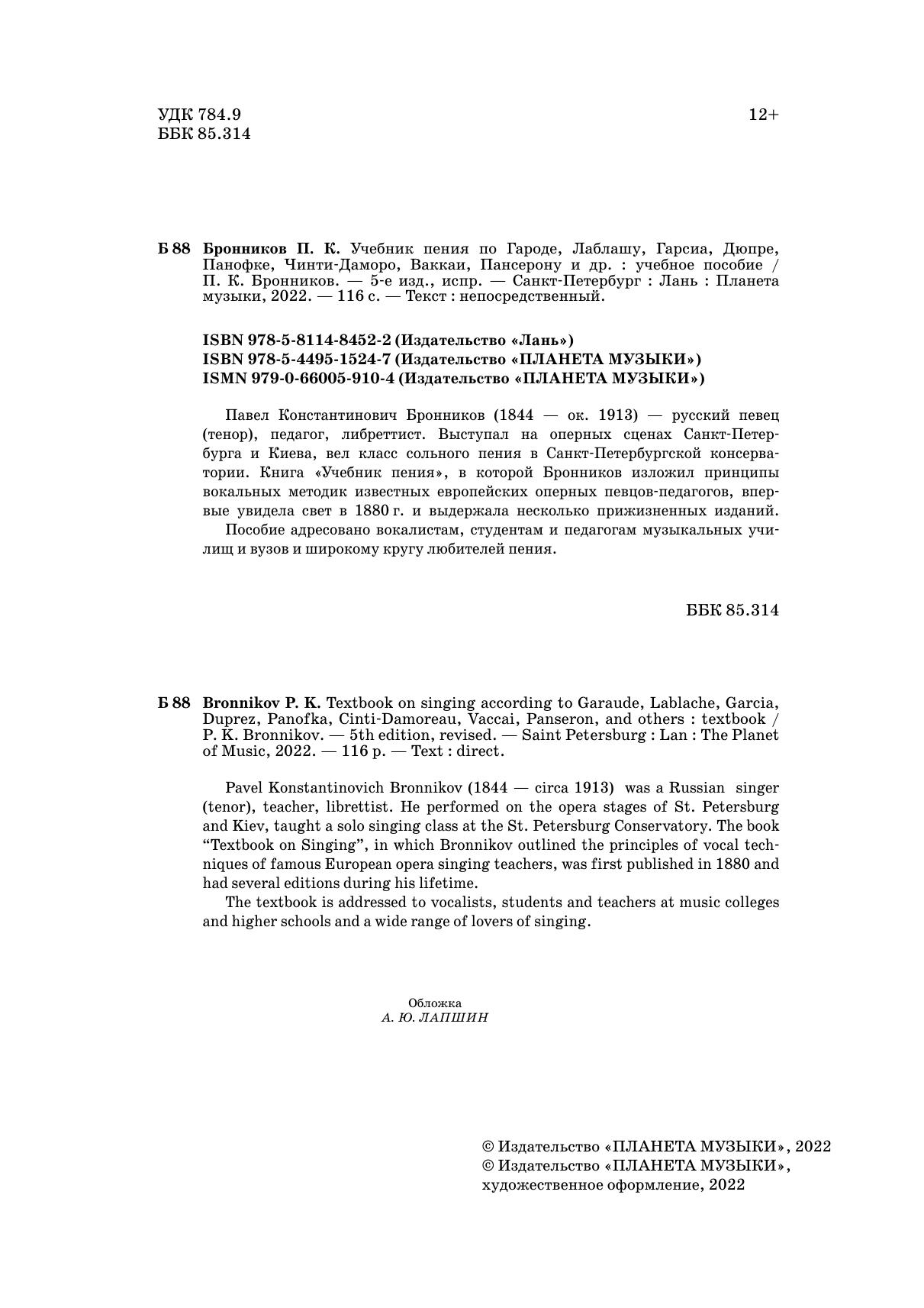 Pavel Konstantinovich Bronnikov (1844 — circa 1913) was a Russian singer (tenor), teacher, librettist. He performed on the opera stages of St. Petersburg and Kiev, taught a solo singing class at the St. Petersburg Conservatory. The book “Textbook of Singing”, in which Bronnikov outlined the principles of vocal techniques of famous European opera singing teachers, was first published in 1880 and had several editions during his lifetime.