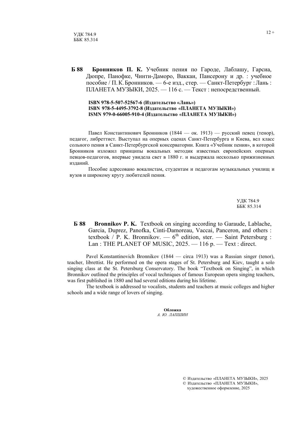 Павел Константинович Бронников (1844 – около 1913) — русский певец (тенор), педагог, либреттист. Выступал на оперных сценах Санкт-Петербурга и Киева, вел класс сольного пения в Санкт-Петербургской консерватории. Книга «Учебник пения», в которой Бронников изложил принципы вокальных методик известных европейских оперных певцов-педагогов, впервые увидела свет в 1880 г. и выдержала несколько прижизненных изданий. Пособие адресовано вокалистам, студентам и педагогам музыкальных училищ и вузов и широкому кругу любителей пения.