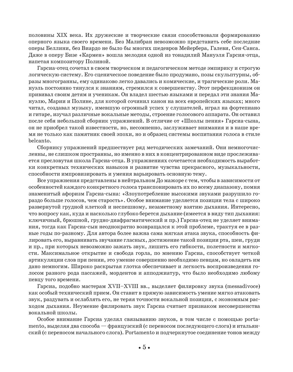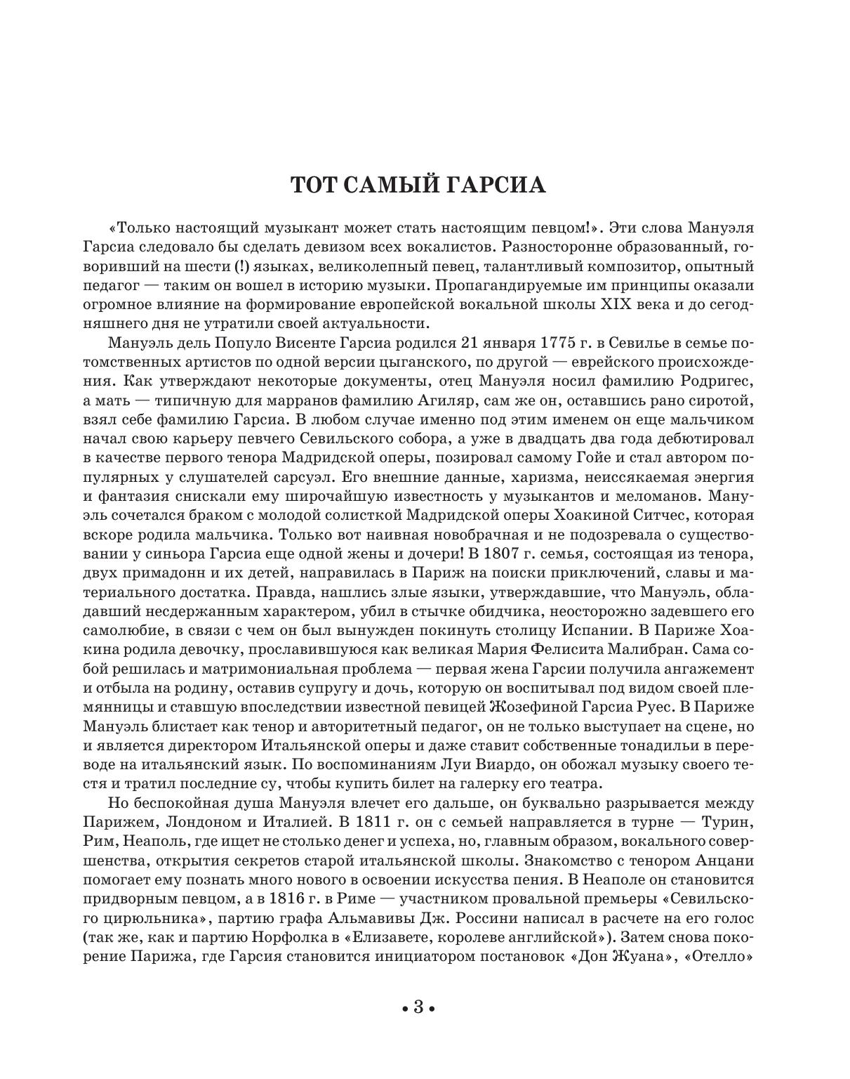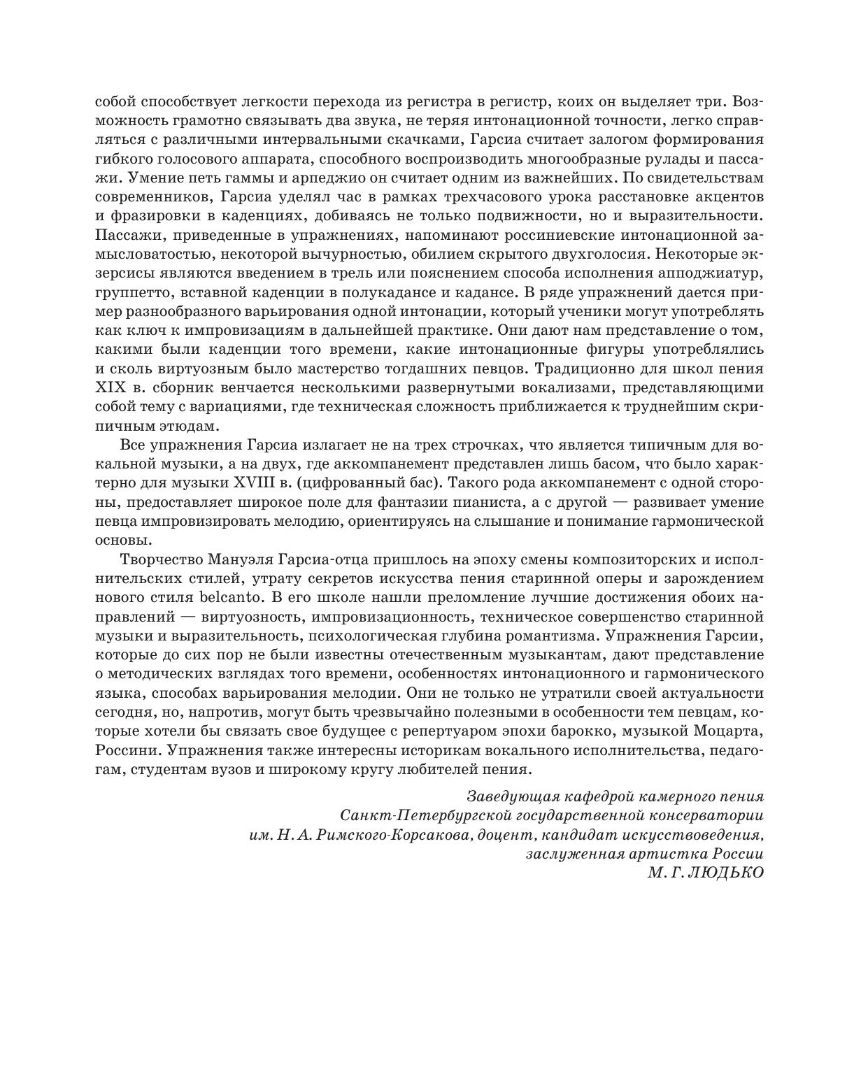 Упражнения М. Гарсии, которые до сих пор не были известны отечественным музыкантам, дают представление о методических взглядах того времени, особенностях интонационного и гармонического языка, способах варьирования мелодии. Они не только не утратили своей актуальности сегодня, но, напротив, могут быть чрезвычайно полезными, в особенности тем певцам, которые хотели бы связать свое будущее с репертуаром эпохи барокко, музыкой Моцарта, Россини. Упражнения также интересны историкам вокального исполнительства, педагогам, студентам вузов, музыкальных училищ и консерваторий, широкому кругу любителей пения.