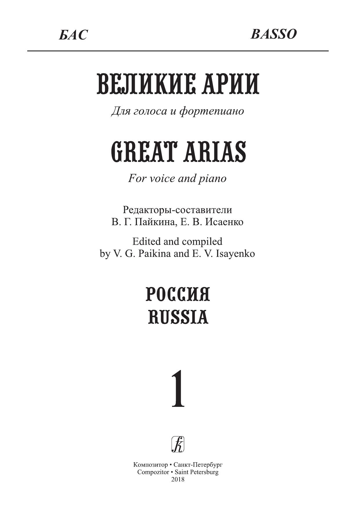 Великие русские арии. Для голоса и фортепиано. Бас. Выпуск 1