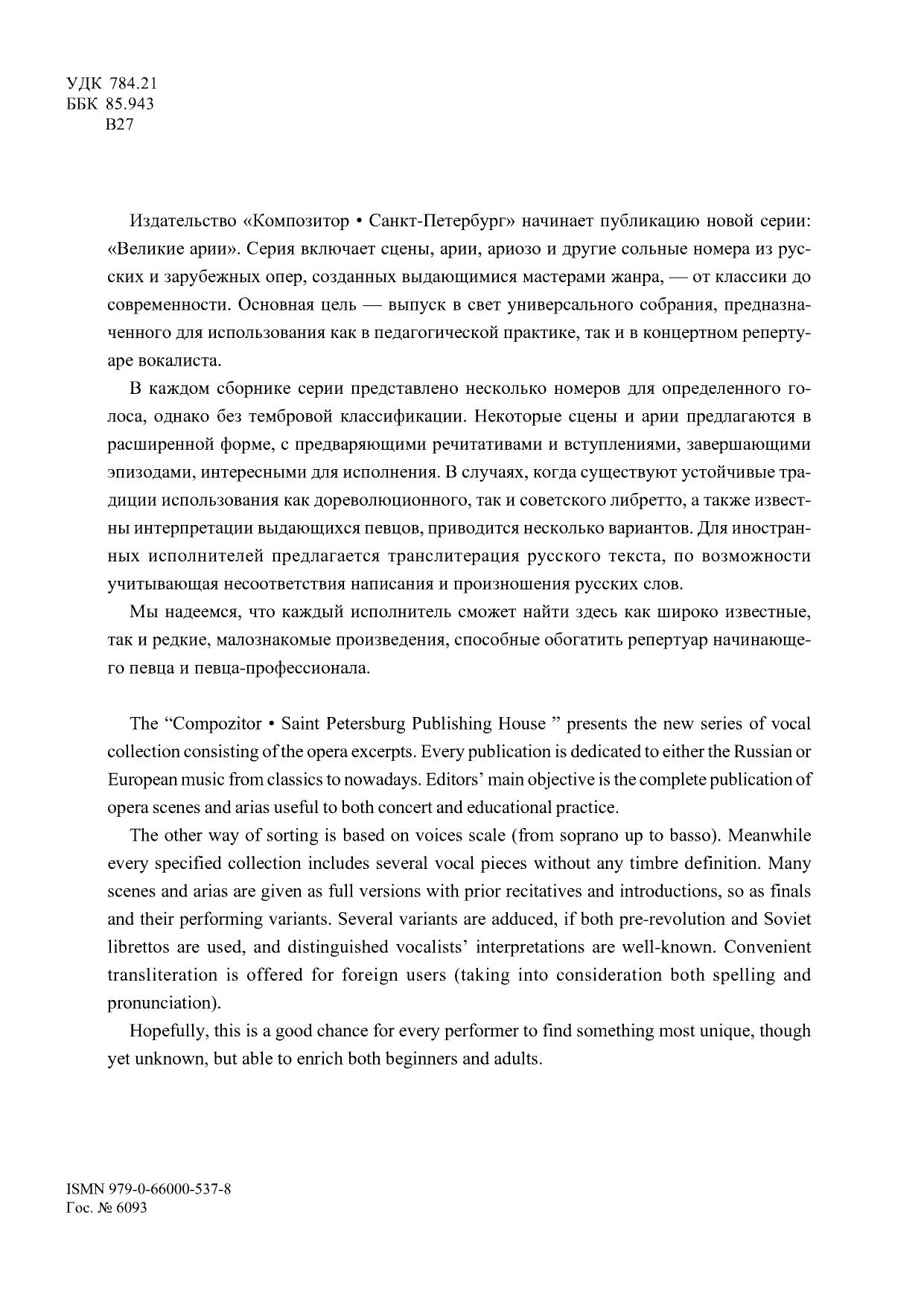 Мы надеемся, что каждый исполнитель сможет найти здесь как широко известные, так и редкие, малознакомые произведения, способные обогатить репертуар начинающего певца и певца-профессионала.