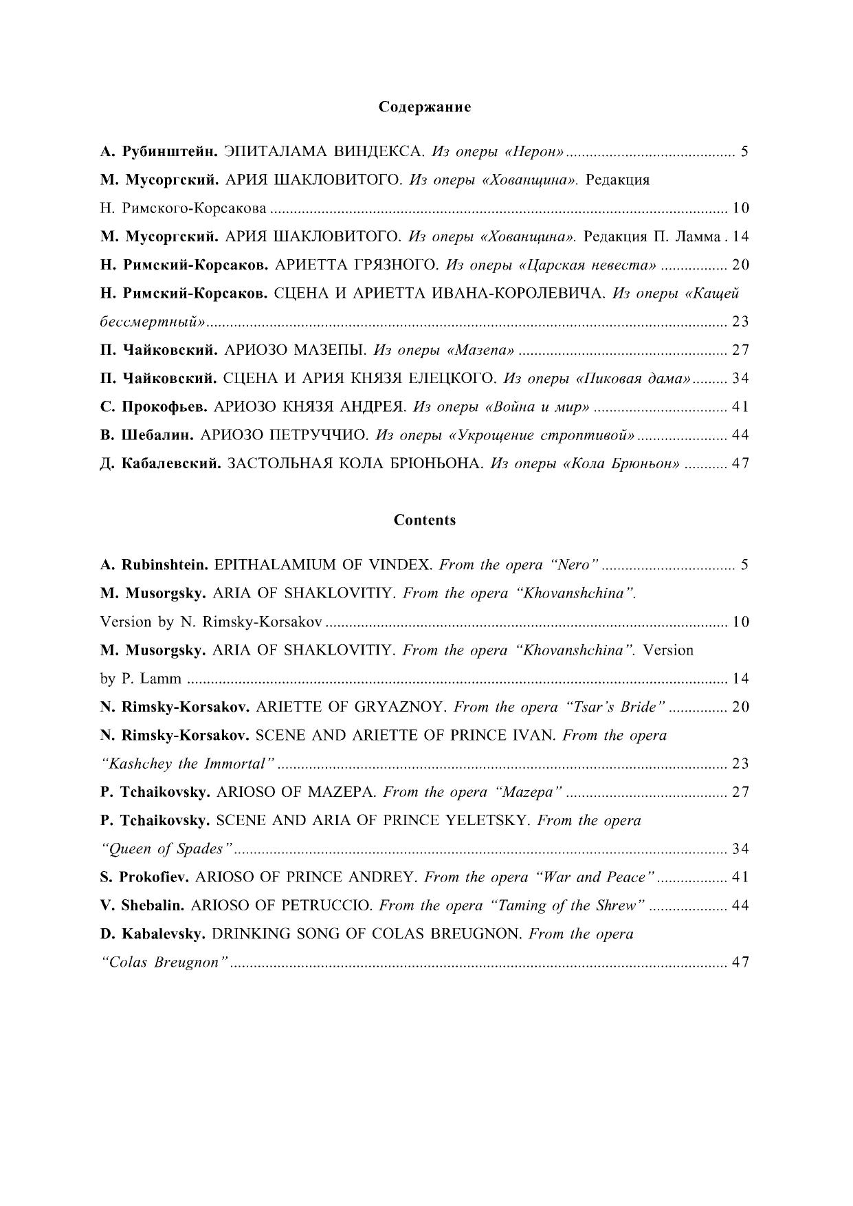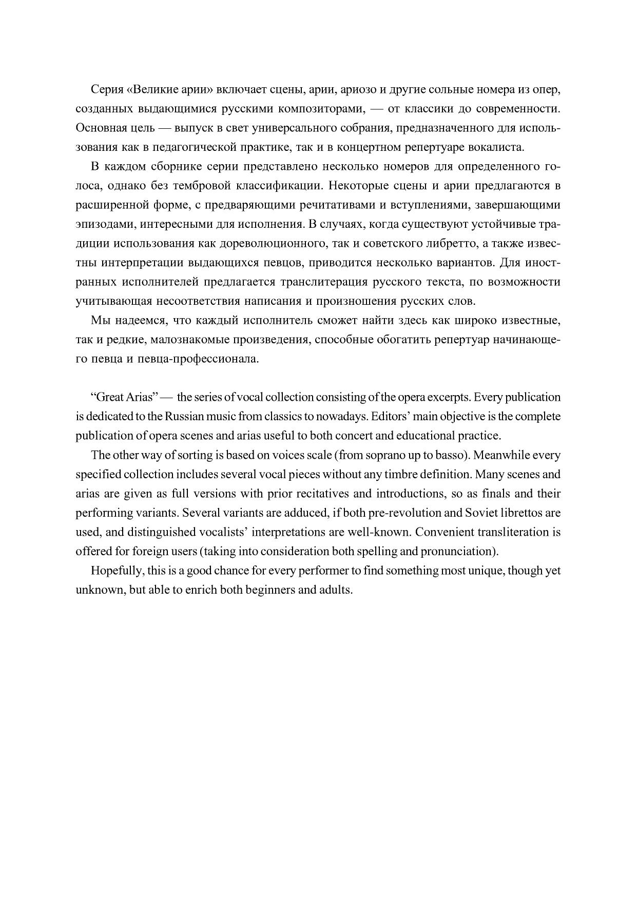 В серии предусмотрен выпуск нескольких томов для каждого голоса — от сопрано до баса, без тембровой классификации. Настоящая публикация отличается расширенной формой многих сцен и арий — с предваряющими речитативами и вступлениями, завершающими эпизодами, интересными для исполнения. В случае традиционного использования как дореволюционного, так и советского либретто, а также интерпретаций и каденций выдающихся певцов приводятся различные варианты исполнения. Иностранным вокалистам предлагается транслитерация русского текста, по возможности учитывающая несоответствия написания и произношения русских слов.