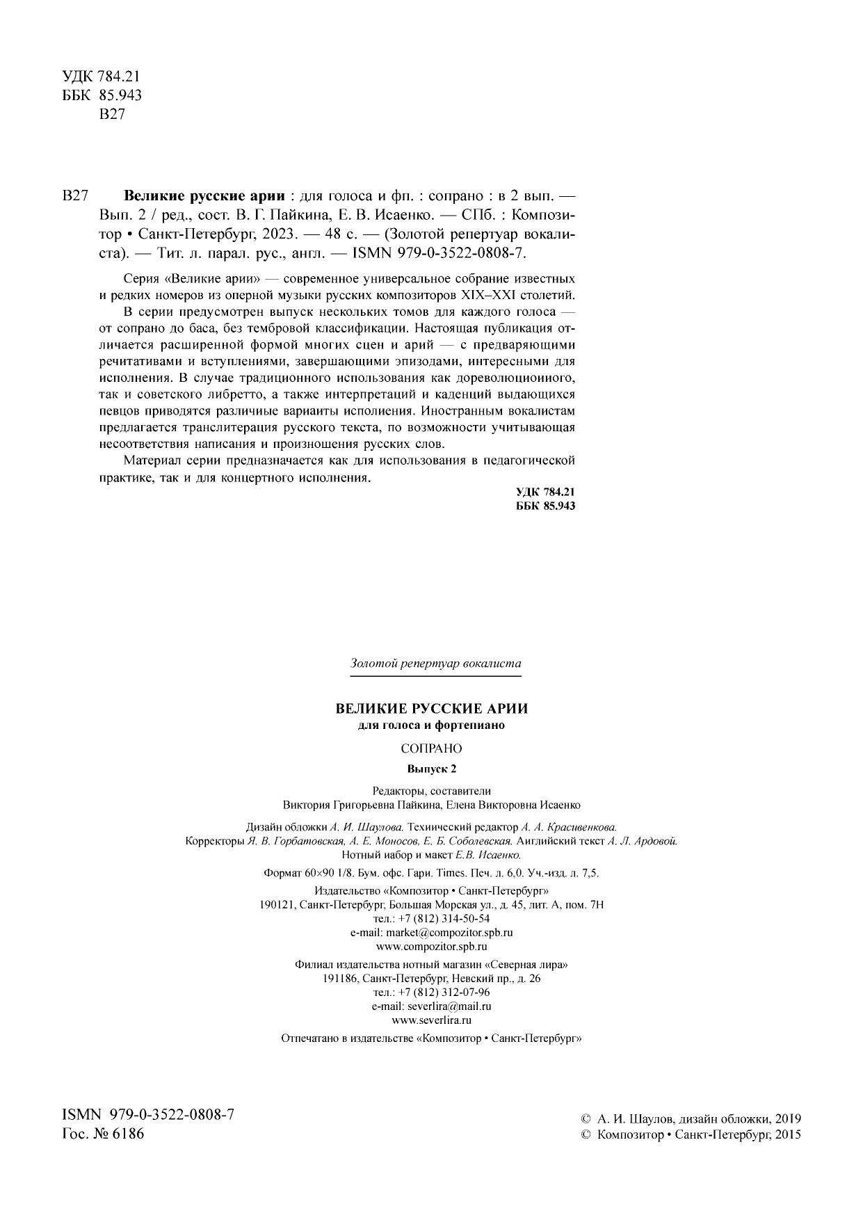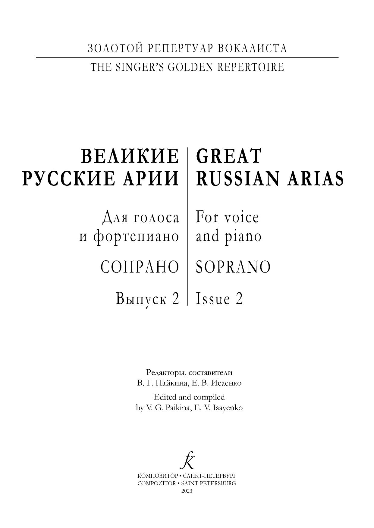 Великие русские арии. Для голоса и фортепиано. Сопрано. Выпуск 2