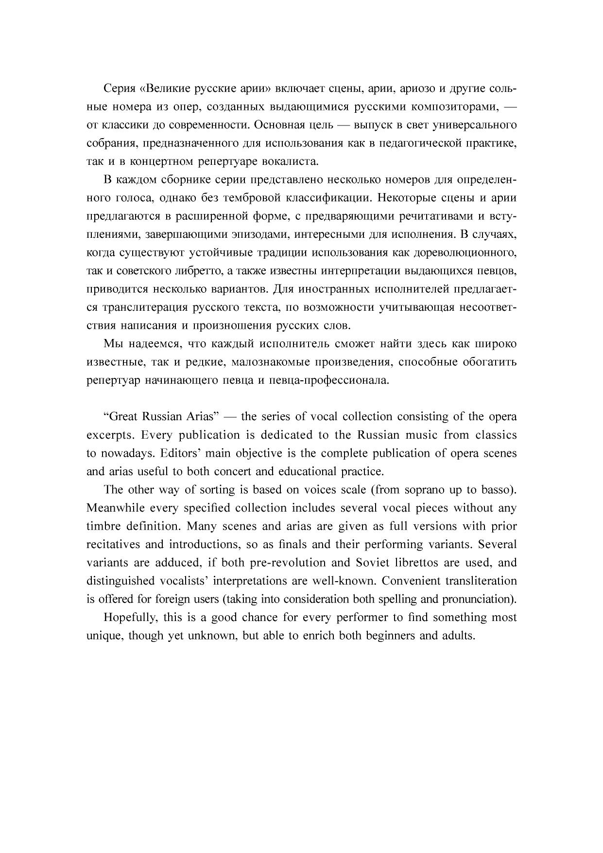 В серии предусмотрен выпуск нескольких томов для каждого голоса — от сопрано до баса, без тембровой классификации. Настоящая публикация отличается расширенной формой многих сцен и арий — с предваряющими речитативами и вступлениями, завершающими эпизодами, интересными для исполнения. В случае традиционного использования как дореволюционного, так и советского либретто, а также интерпретаций и каденций выдающихся певцов приводятся различные варианты исполнения. Иностранным вокалистам предлагается транслитерация русского текста, по возможности учитывающая несоответствия написания и произношения русских слов.