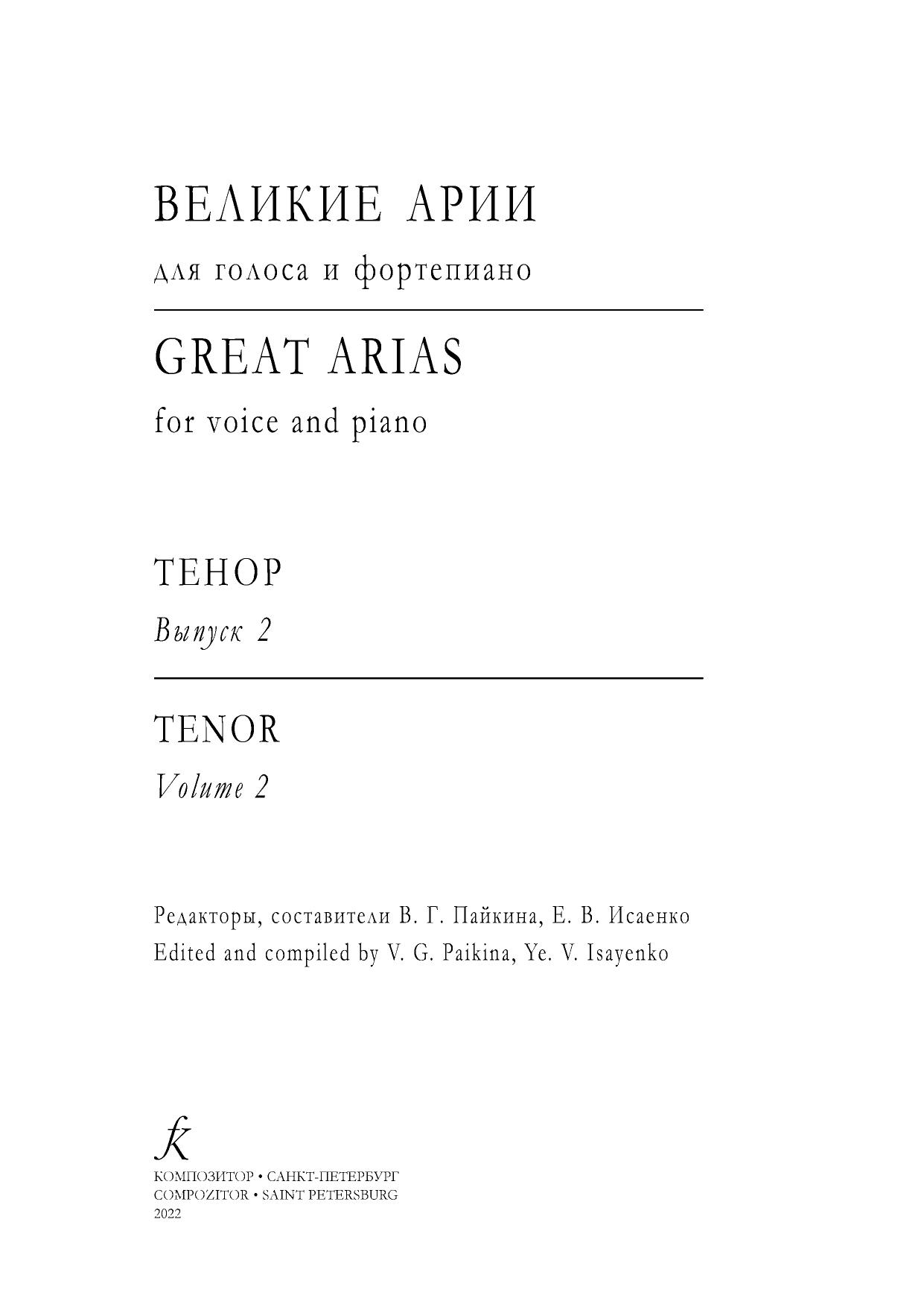 Великие русские арии. Для голоса и фортепиано. Тенор. Выпуск 2