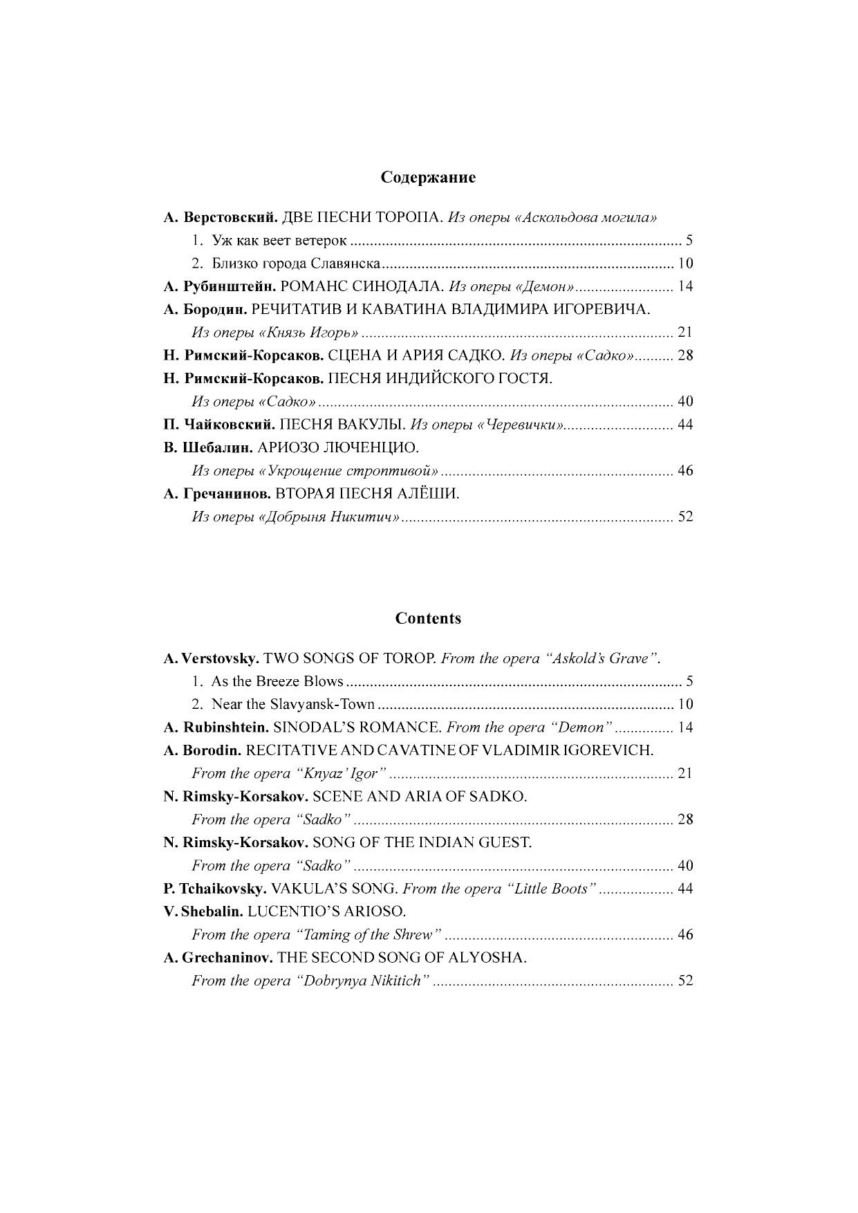 В серии предусмотрен выпуск нескольких томов для каждого голоса — от сопрано до баса, без тембровой классификации. Настоящая публикация отличается расширенной формой многих сцен и арий — с предваряющими речитативами и вступлениями, завершающими эпизодами, интересными для исполнения. В случае традиционного использования как дореволюционного, так и советского либретто, а также интерпретаций и каденций выдающихся певцов приводятся различные варианты исполнения. Иностранным вокалистам предлагается транслитерация русского текста, по возможности учитывающая несоответствия написания и произношения русских слов.