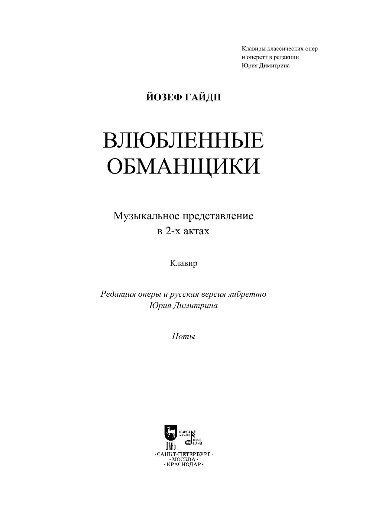 «Влюблённые обманщики» – двухактная версия оперы-буфф «Аптекарь» («Lo Speziale») Й. Гайдна и К. Гольдони. «Аптекарь» – первоначально трехактная комическая опера, однако именно ее одноактная версия (с речитативами вместо разговорных сцен, с немецким текстом либретто) наиболее известна из всех тридцати опер Гайдна. Настоящая версия была создана Ю. Димитриным в 1981 году на основе принадлежащего ему же свободного перевода одноактного либретто «Аптекаря». В ней появляется новый персонаж Цехина, а также разговорные эпизоды, в основе которых лежат фрагменты некоторых сцен комедии К. Гольдони «Специалист». Вокальный текст «Аптекаря» также претерпел некоторые изменения, связанные с трансформацией сюжета оперы. Адресовано солистам-вокалистам оперных театров, студентам и педагогам вокальных отделений, а также всем любителям оперного искусства. “The Liars in Love” is a two-act version of the opera buffa “The Apothecary” (“Lo Speziale”) by J. Haydn and C. Goldoni. “The Apothecary” was originally a comic opera in 3 acts, but it’s namely the one-act version (with recitatives instead of dialogues, to a German libretto) that is the best known among all thirty of Haydn’s operas. The current version was created by Y. Dimitrin in 1981 and based on his own free translation of “The Apothecary” one-act libretto. It introduces Zecchina, a new character. “The Apothecary” lyrics also underwent some changes due to the changes of the opera’s plot. It is addressed to soloists of music theatres, to students and teachers of vocal departments, and also for all opera lovers.