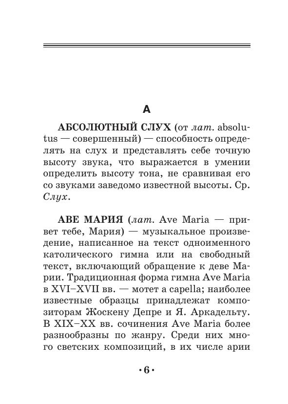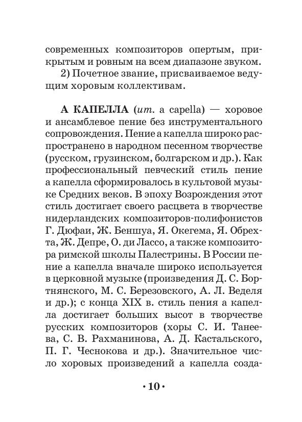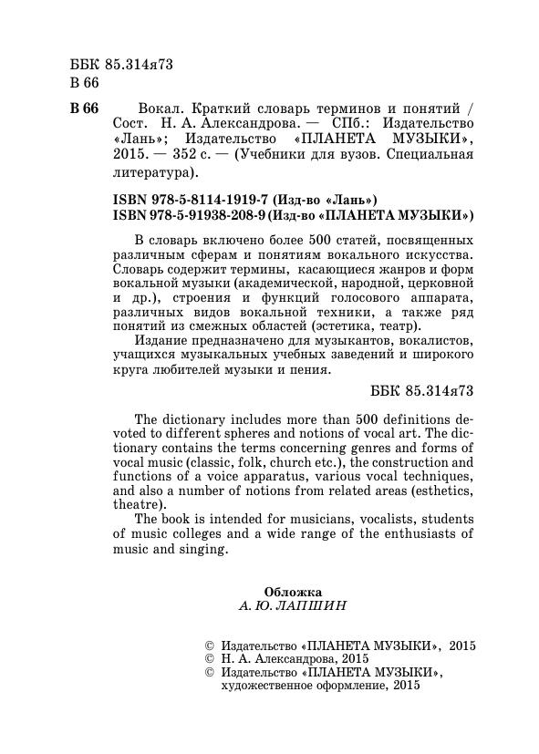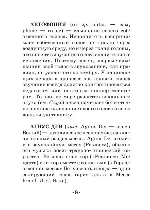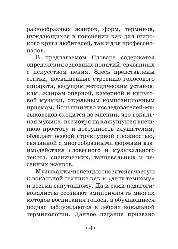 The dictionary includes more than 500 definitions devoted to different spheres and notions of vocal art. The dictionary contains the terms concerning genres and forms of vocal music (classic, folk, church etc.), the construction and functions of a voice apparatus, various vocal techniques, and also a number of notions from related areas (esthetics, theatre).