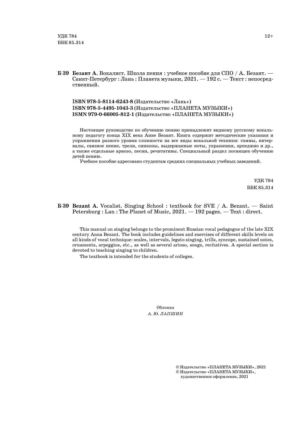 This manual on singing belongs to the prominent Russian vocal pedagogue of the late XIX century Anna Bezant. The book includes guidelines and exercises of different skills levels on all kinds of vocal technique: scales, intervals, legato singing, trills, syncope, sustained notes, ornaments, arpeggios, etc., as well as several arioso, songs, recitatives. A special section is devoted to teaching singing to children.