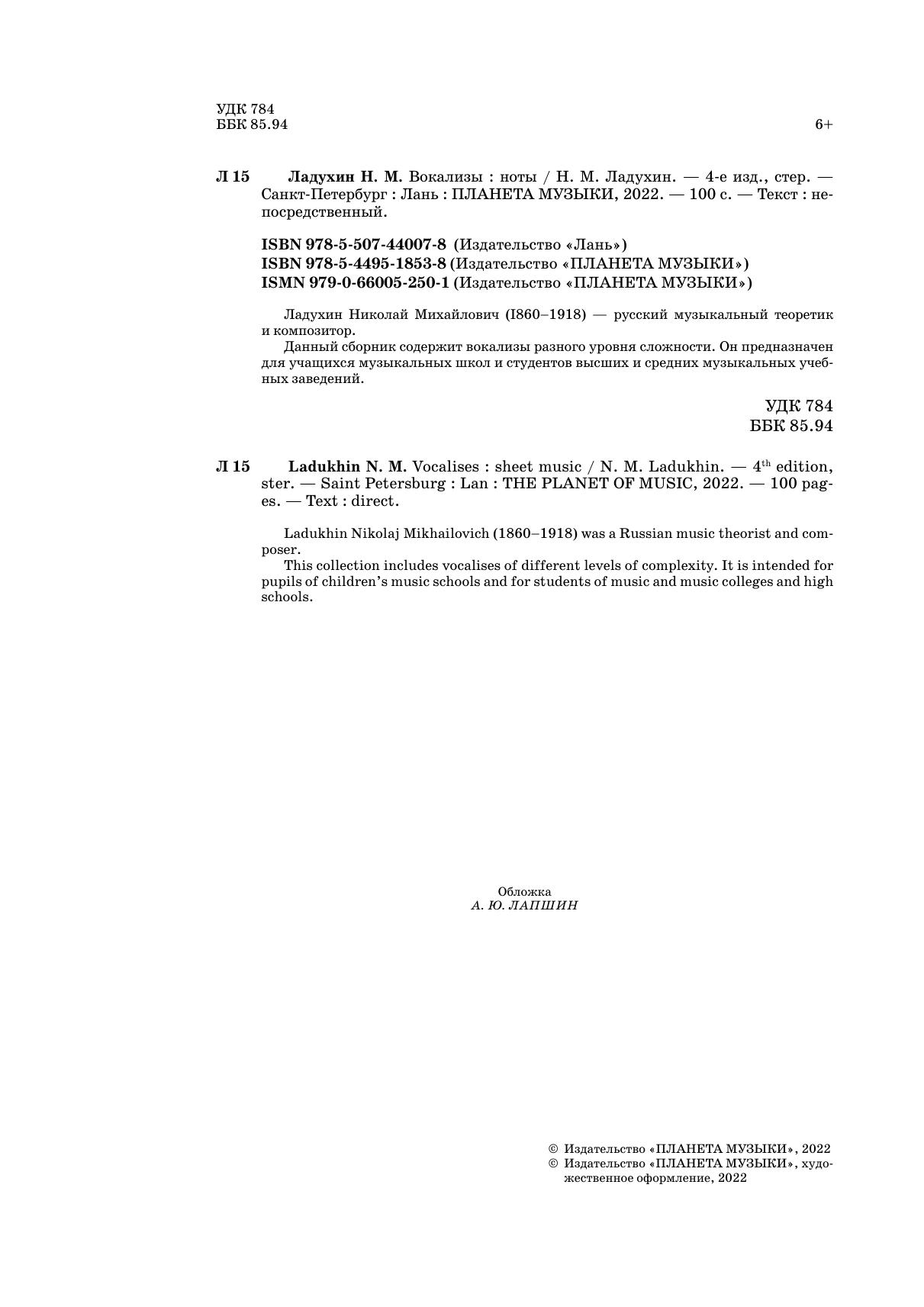 Ладухин Николай Михайлович (I860 – 1918) – русский музыкальный теоретик и композитор. Данный сборник содержит вокализы разного уровня сложности.