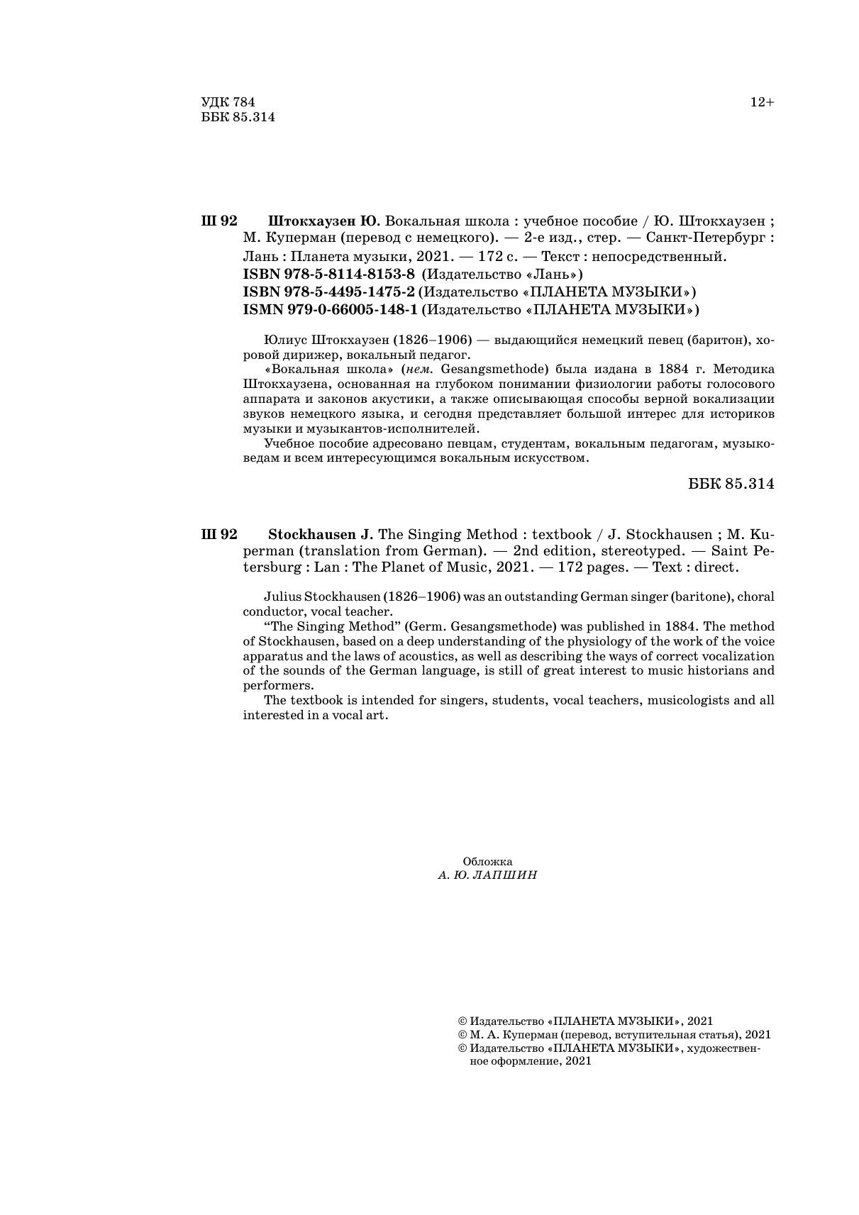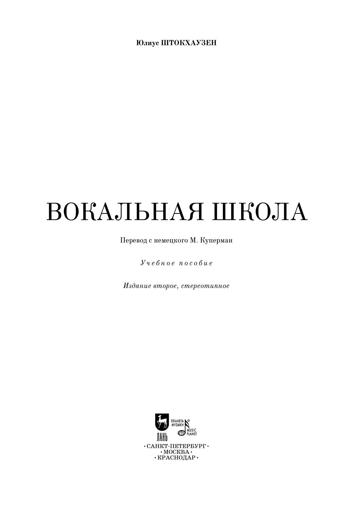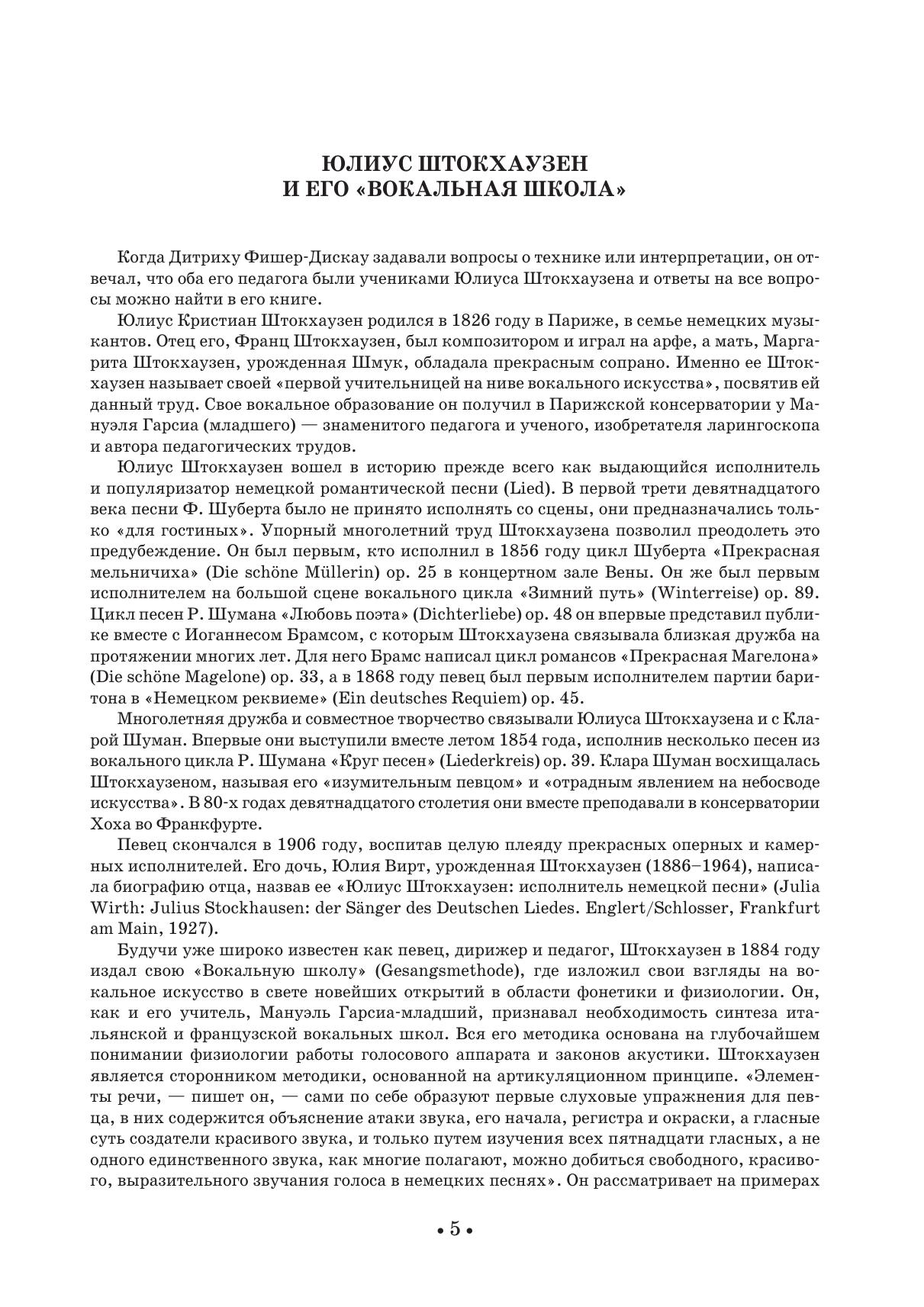 “The Singing Method” (Germ. Gesangsmethode) was published in 1884. The method of Stockhausen, based on a deep understanding of the physiology of the work of the voice apparatus and the laws of acoustics, as well as describing the ways of correct vocalization of the sounds of the German language, is still of great interest to music historians and performers.
