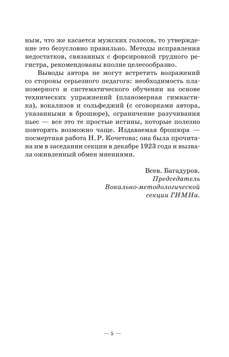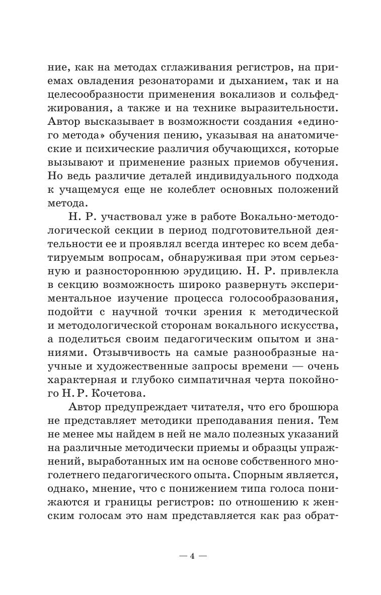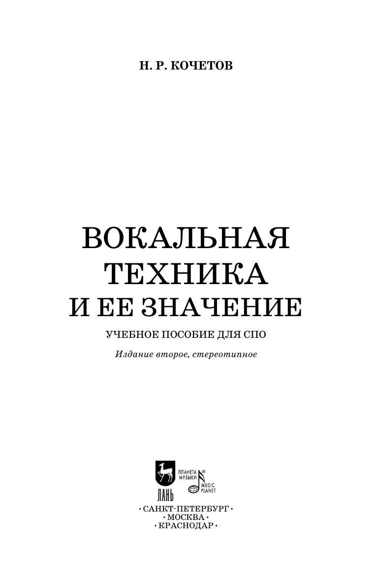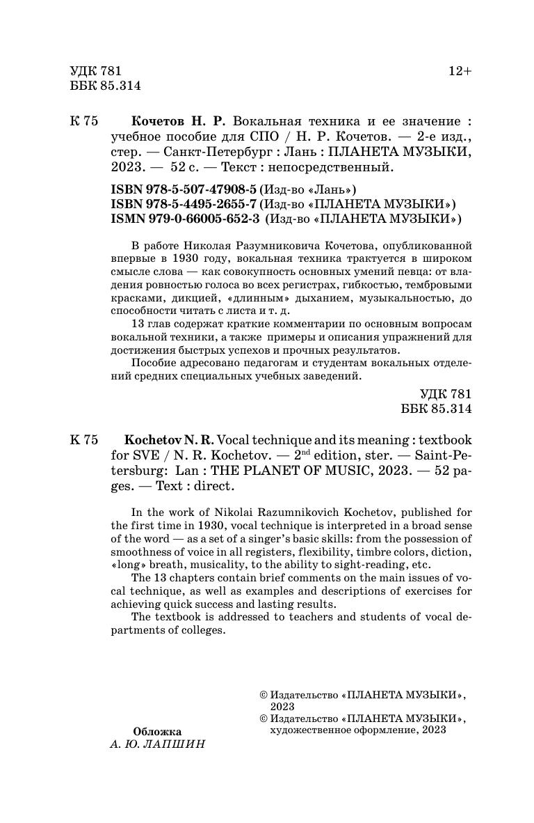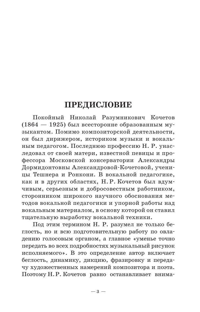 В работе Николая Разумниковича Кочетова, опубликованной впервые в 1930 году, вокальная техника трактуется в широком смысле слова - как совокупность основных умений певца: от владения ровностью голоса во всех регистрах, гибкостью, тембровыми красками, дикцией, «длинным» дыханием, музыкальностью, до способности читать с листа и т.д. 13 глав содержат краткие комментарии по основным вопросам вокальной техники, а также примеры и описания упражнений для достижения быстрых успехов и прочных результатов. Соответствует современным требованиям Федерального государственного образовательного стандарта среднего профессионального образования и профессиональным квалификационным требованиям. Пособие адресовано педагогам и студентам вокальных отделений средних специальных учебных заведений. In the work of Nikolai Razumnikovich Kochetov, published for the first time in 1930, vocal technique is interpreted in a broad sense of the word - as a set of a singer’s basic skills: from the possession of smoothness of voice in all registers, flexibility, timbre colors, diction, "long" breath, musicality, to the ability to sight-reading, etc. The 13 chapters contain brief comments on the main issues of vocal technique, as well as examples and descriptions of exercises for achieving quick success and lasting results. Corresponds to the modern requirements of the Federal State Educational Standard of Secondary Vocational Education and professional qualification requirements. The manual is addressed to teachers and students of vocal departments of colleges.