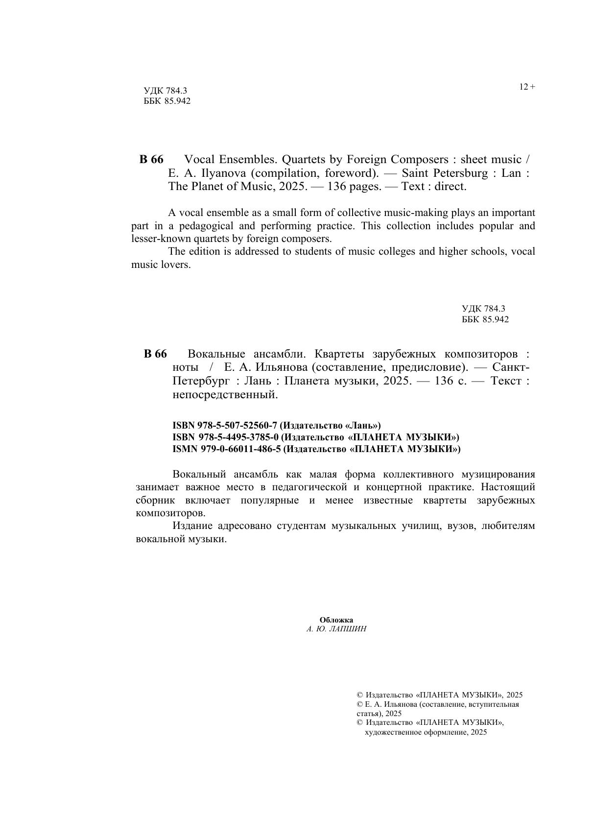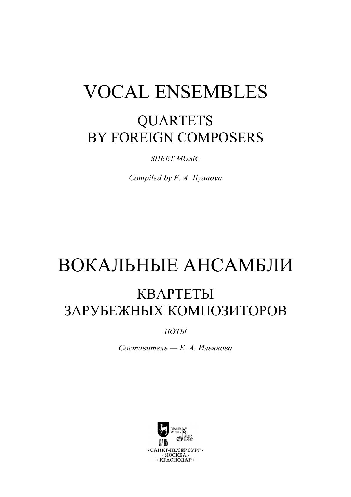 Вокальный ансамбль как малая форма коллективного музицирования занимает важное место в педагогической и концертной практике. Настоящий сборник включает популярные и менее известные квартеты зарубежных композиторов. Издание адресовано студентам музыкальных училищ, вузов, любителям вокальной музыки. A vocal ensemble as a small form of collective music-making plays an important part in a pedagogical and performing practice. This collection includes popular and lesser-known quartets by foreign composers. The edition is addressed to students of music colleges and higher schools, vocal music lovers.